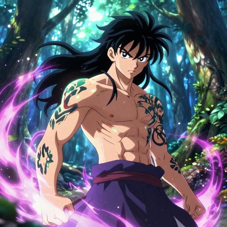 Anime boy buff with glowing tattoos tracing his muscular arms and chest, standing in a mystical forest clearing, ethereal light filtering through leaves, long wild hair and fierce expression, magical energy swirling around him in vivid colors.