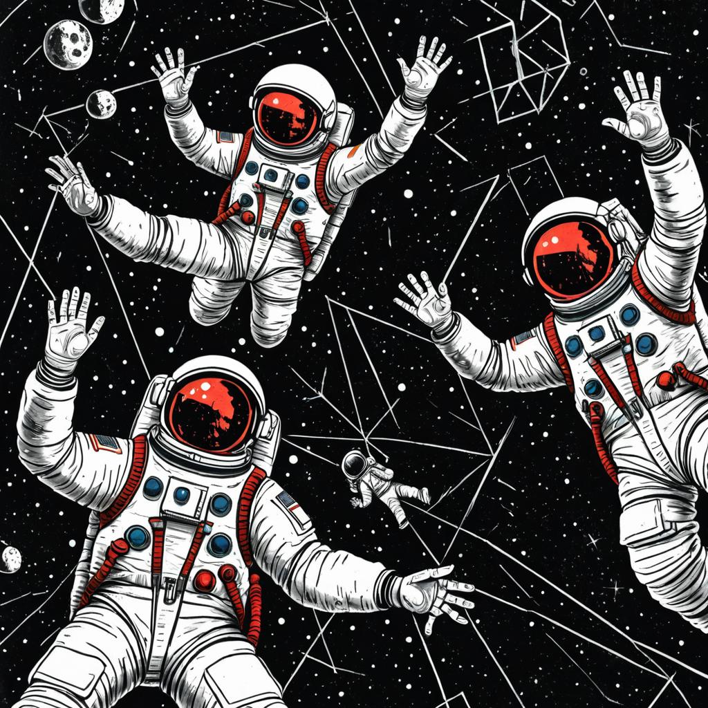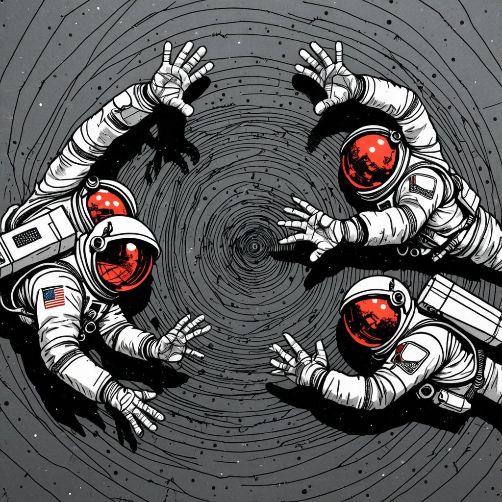 Sketch 2 astronauts floating in space with their heads missing except their eyeballs, distorted arms coming from the abyss trying to grab onto the astronauts with mangled fingers, in the style of surrealism, mixed media, paper cut outs and distress with noise and scratches, ultra 8k, high detail, grey and red, geometric shapes, Golden ratio, extra detail, - Upscaled (Light) by