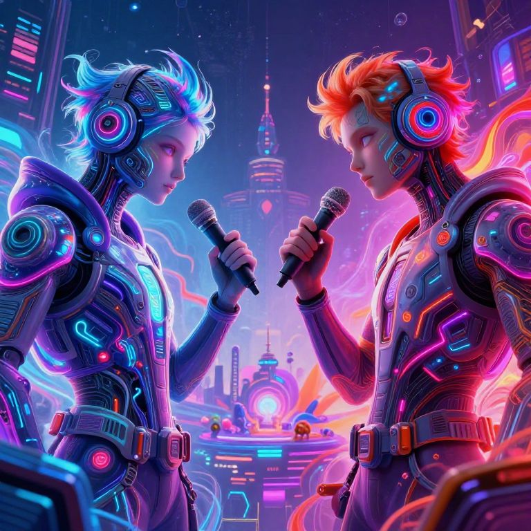 Digital artwork of two futuristic, neon-lit, cybernetic musicians with colorful hair, holding microphones, in a vibrant, neon-lit city