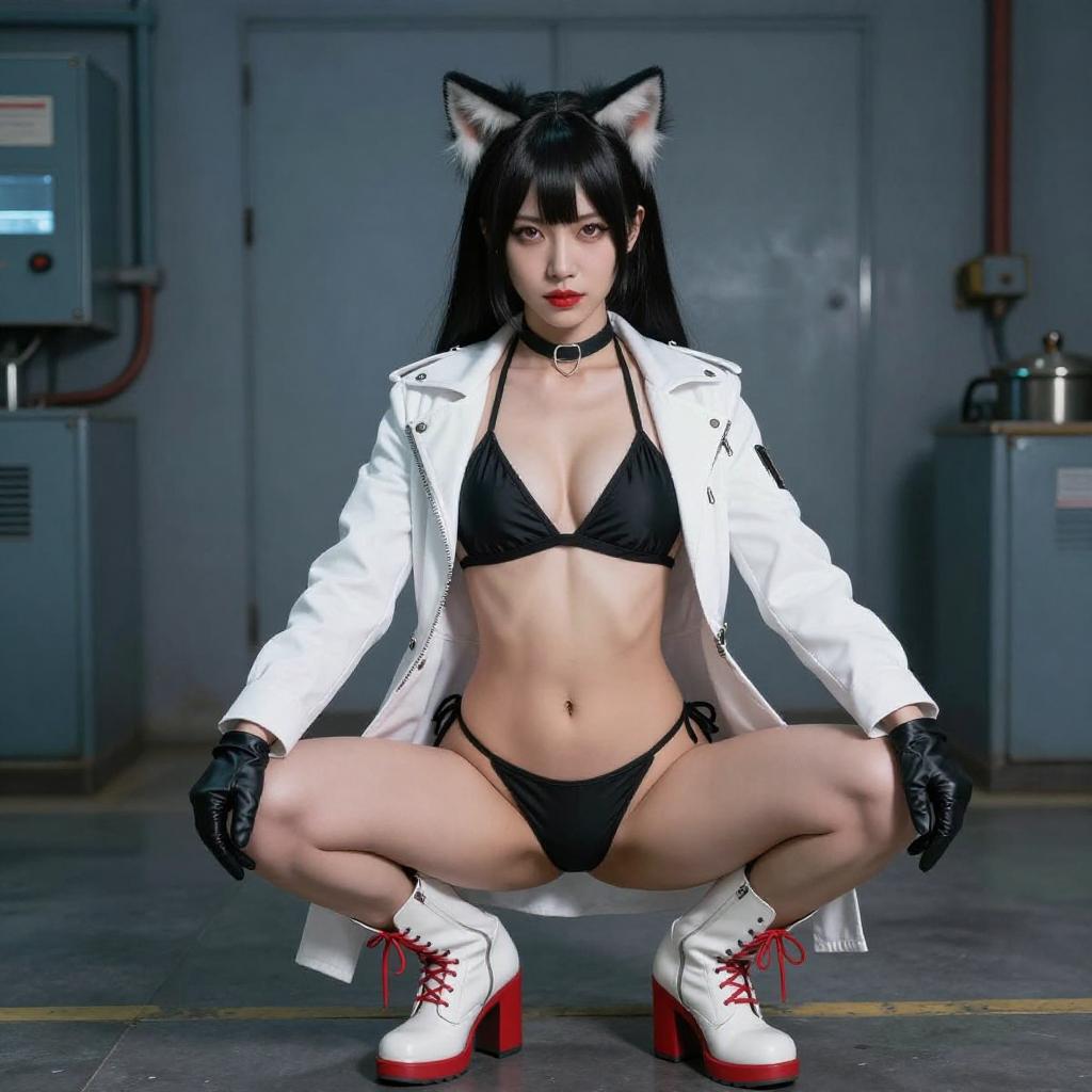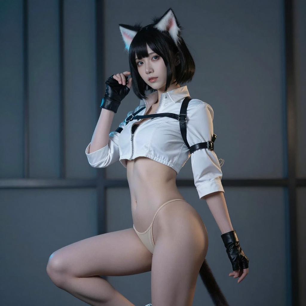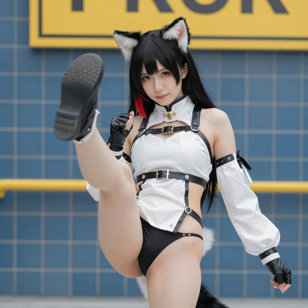 Photograph of an Asian woman in a black and white cosplay outfit with cat ears, black hair, and red-tipped bangs. She is kicking forward, revealing her black thong and white jacket with black gloves. The background features blue-tiled walls and a yellow sign. Her expression is confident, and her skin is fair.