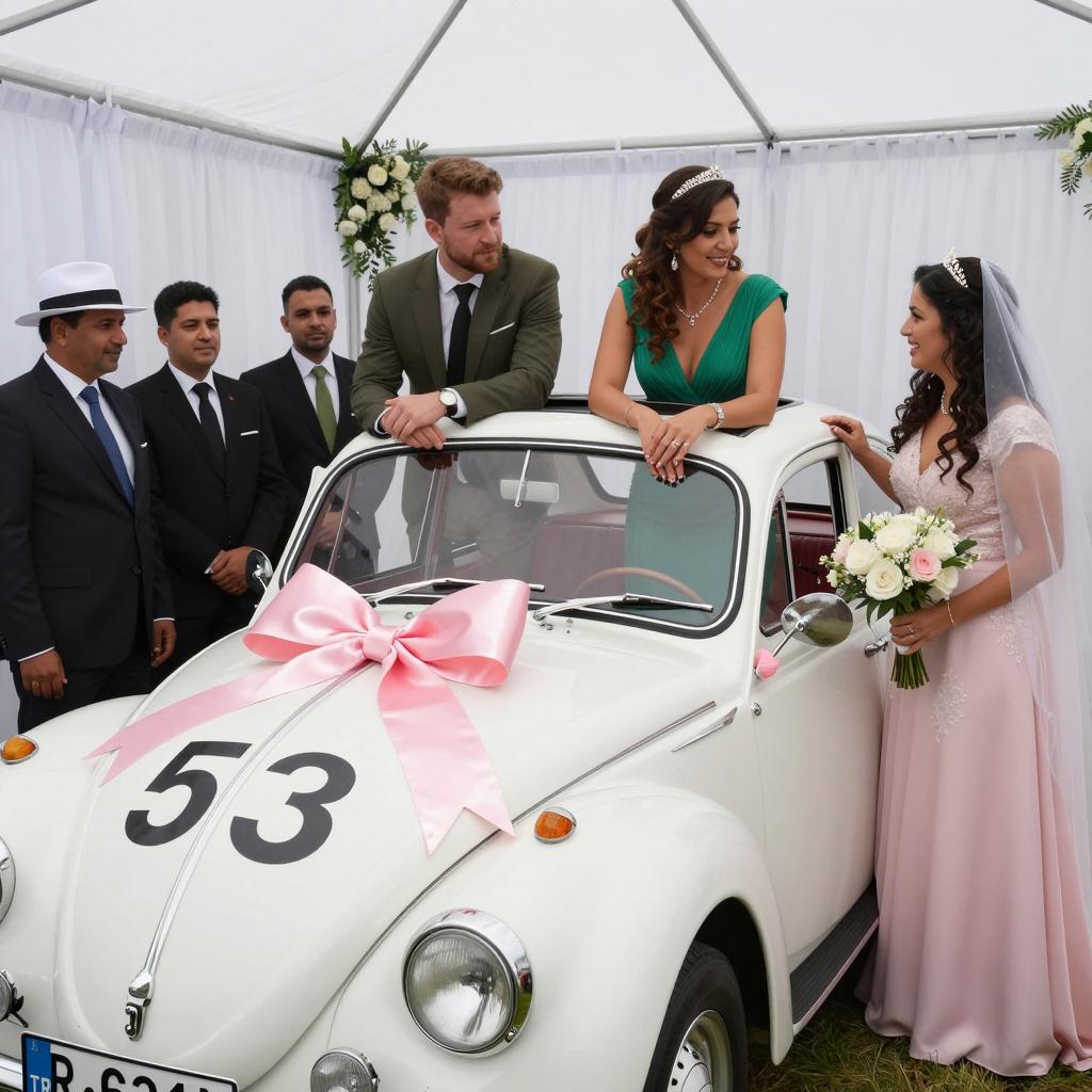 A wedding scene. A white vintage car with pink satin bow, number "53" on hood. Man in green jacket, woman in green dress lean out car window. Three men in suits, one with white hat, stand on left. Bride in pink dress, veil, stands right. Decorated interior, white drapes, flowers. Number plate "TR 631".