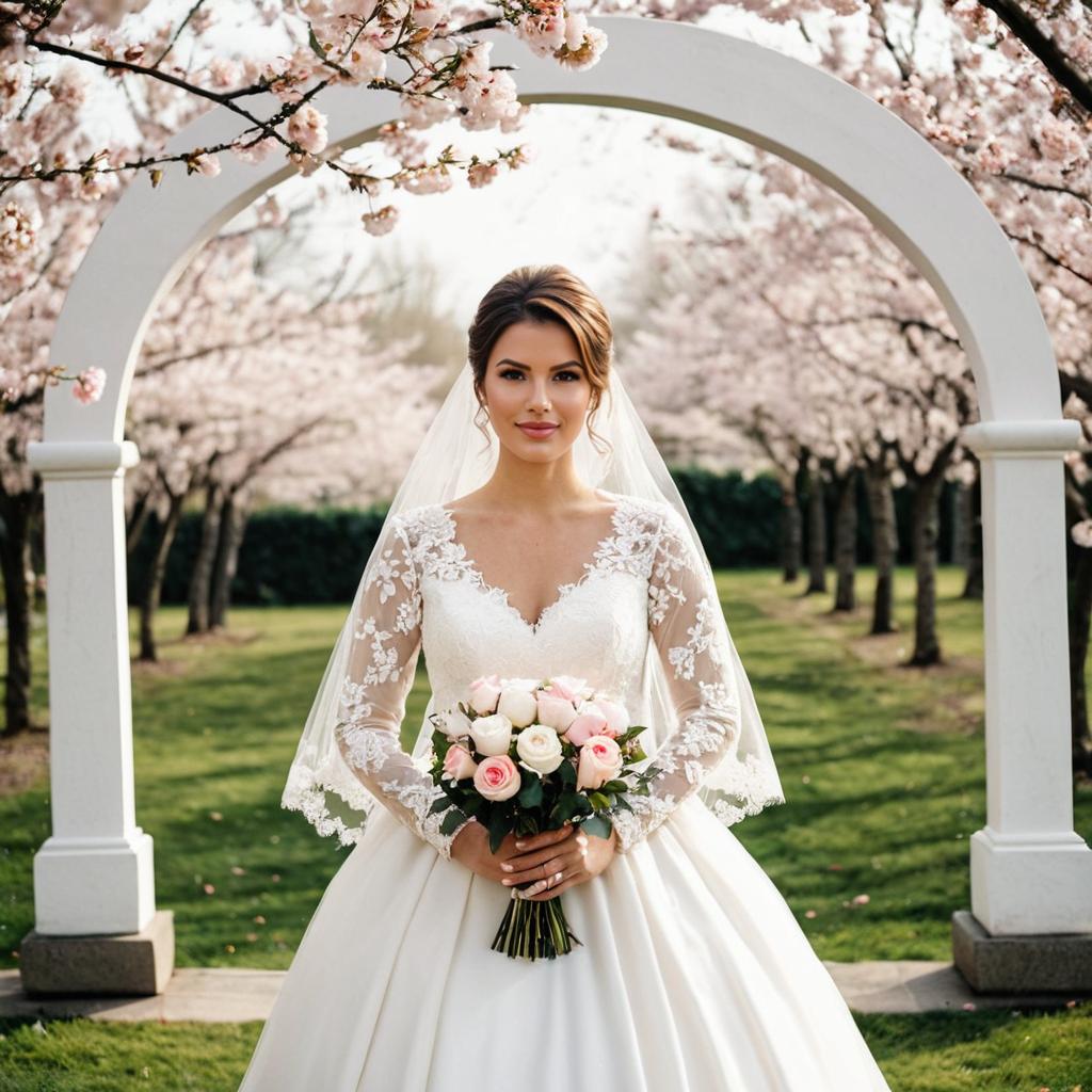 A wedding scene featuring a white vintage car decorated with a large pink satin bow and the number '53' on the hood. A man in a green jacket and a woman in a green dress lean out of the car windows. On the left, three men in suits, one wearing a white hat, stand together. On the right, a bride in a pink lace wedding dress with a veil and tiara holds a bouquet of white and pink flowers. The background is adorned with white drapes and floral decoration.