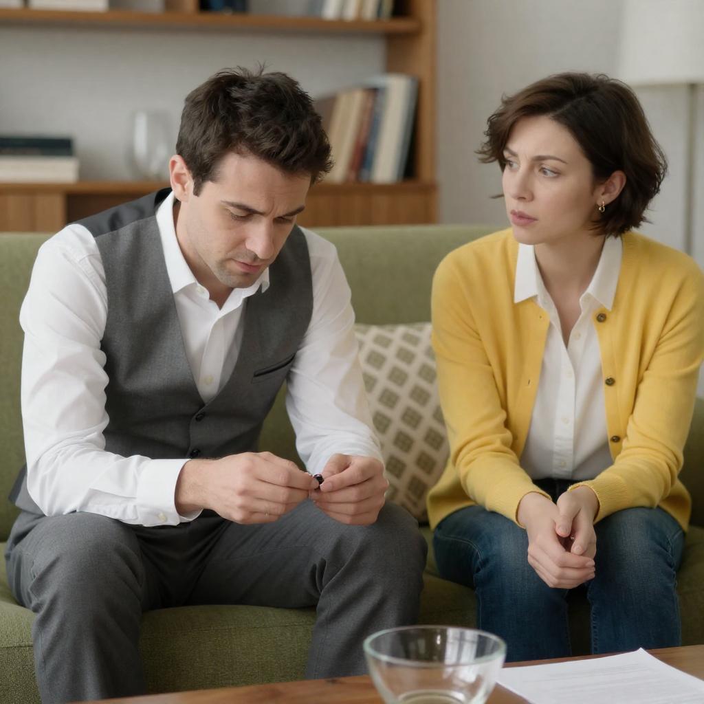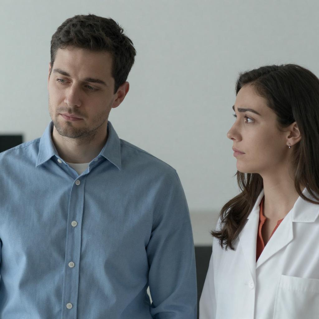 Photograph of a man and woman standing indoors. Man with short dark hair, light stubble, blue shirt, eyes down, expression neutral. Woman with long brown hair, white lab coat, orange shirt, looking at man with slight frown. Background blurred. Man on left, woman on right. Both looking at each other.