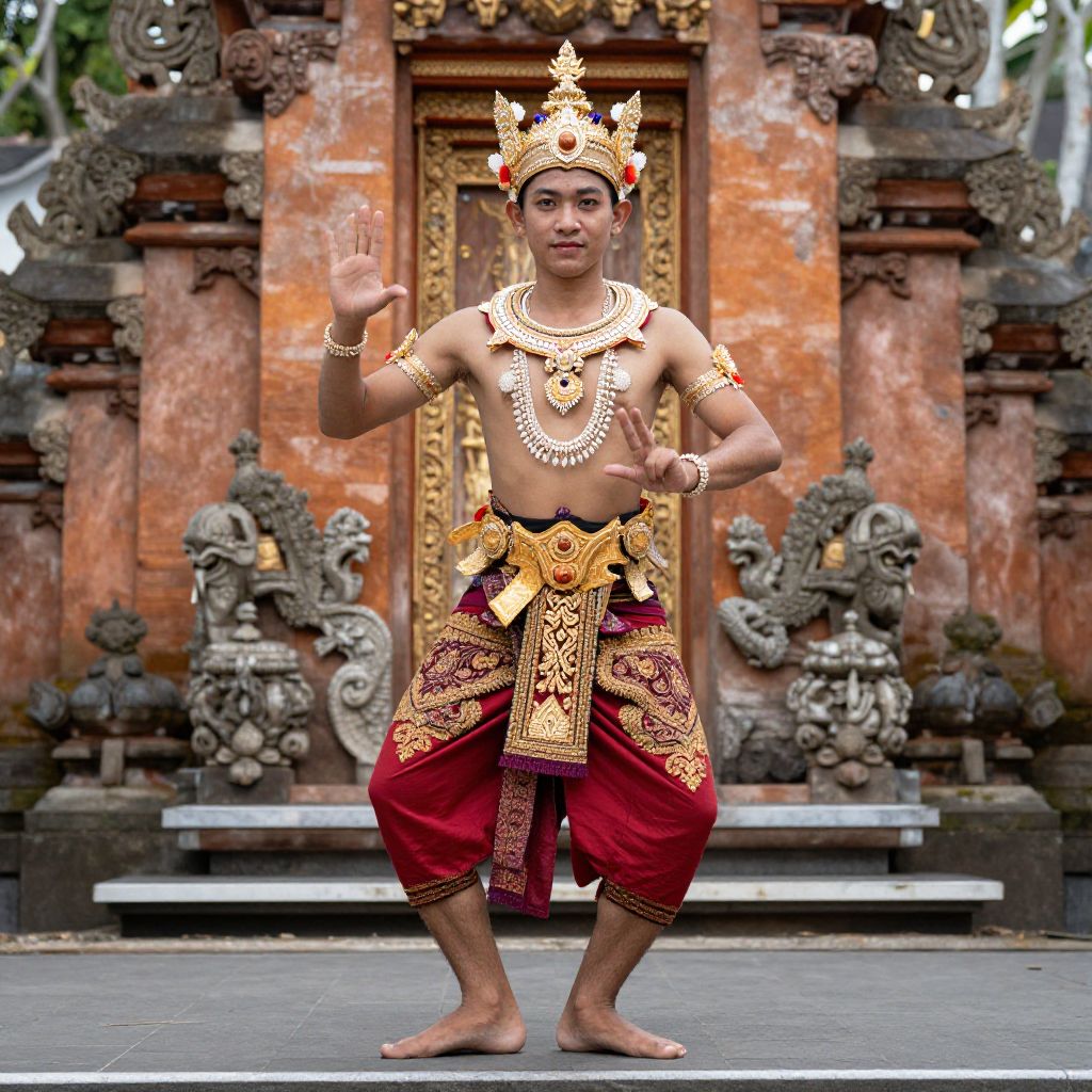 Photograph of a young male dancer in traditional Balinese attire standing barefoot on a paved area. He wears a golden crown adorned with red flowers, ornate gold necklaces, and armlets. His chest is bare, exposing a lean, muscular build. He wears red and gold patterned pants with intricate designs and a gold sash. His hands are raised in a traditional dance gesture. The background features a red-orange stone temple with detailed carvings and statues of mythical creatures. The scene is rich in cultural and historical elements, capturing the vibrant heritage of Balinese dance and art.
