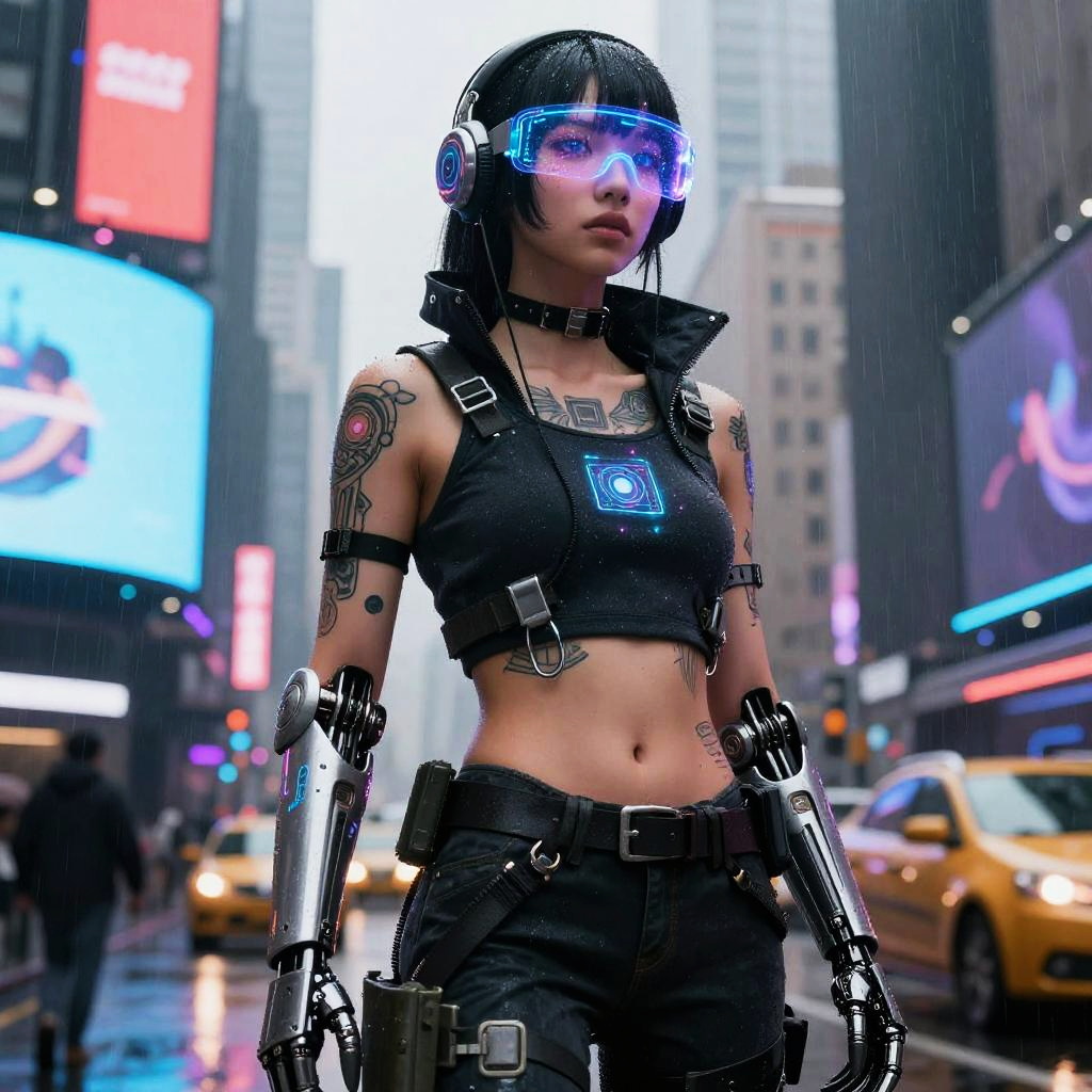 AI character fusion generator showcasing a cyberpunk-inspired character blending human and AI characteristics, with holographic tattoos, augmented reality visors, and mechanized exoskeleton parts, set in an urban environment filled with rain and digital billboards.