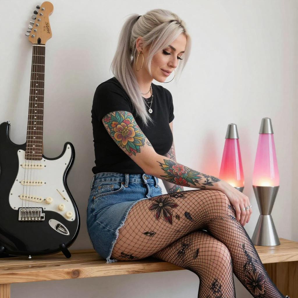 Photograph of a white woman with platinum blonde hair in a ponytail, wearing a black short-sleeve shirt, blue denim skirt, and black fishnet tights with large floral patterns. She has colorful tattoos on her right arm. She sits on a wooden shelf, with a black electric guitar and pink lava lamps behind her.