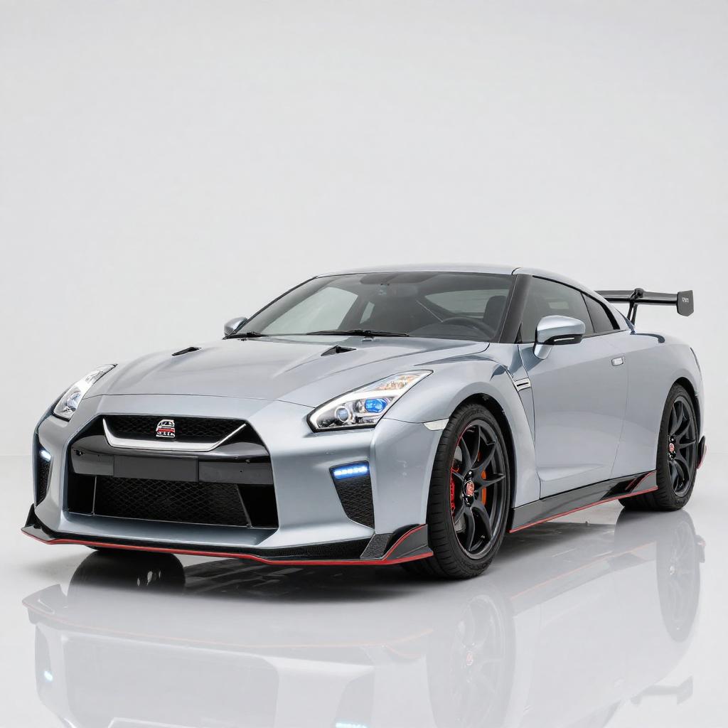 Hyper-realistic 8K image of a futuristic luxury Nissan GT-R in silver with sleek design and sharp aerodynamic lines. Features include a bold front grille, blue LED headlights, and a large rear spoiler. Displayed on a reflective white background highlighting the car's aggressive stance and sporty aesthetics.