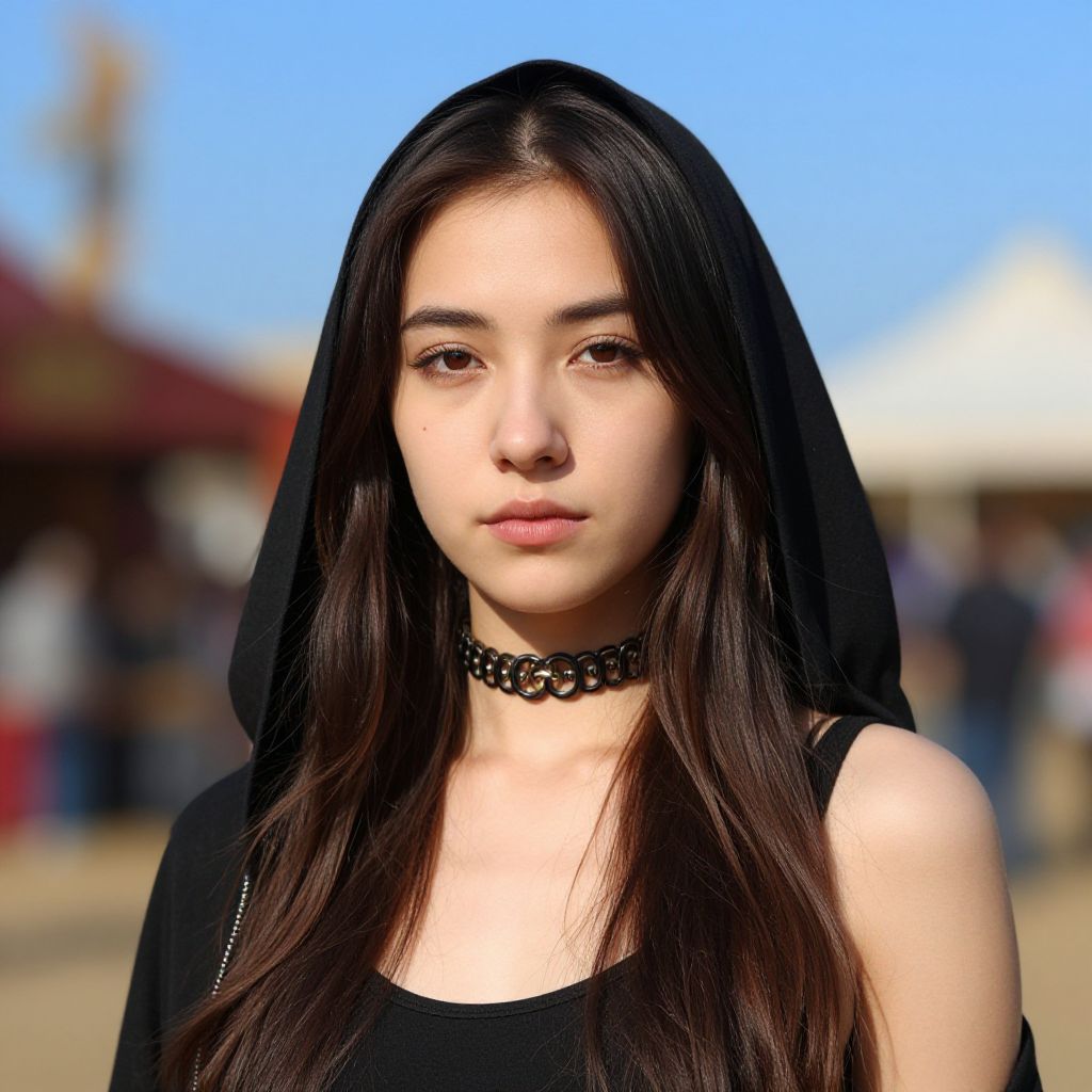 "gypsy renaissance faire, 1girl, solo, choker, looking at viewer, blurry background, brown hair, long hair, closed mouth, realistic, black choker, outdoors, blurry, black hair, hood, day, blue sky, upper body Realistic photo of casual sexy person with pretty face"