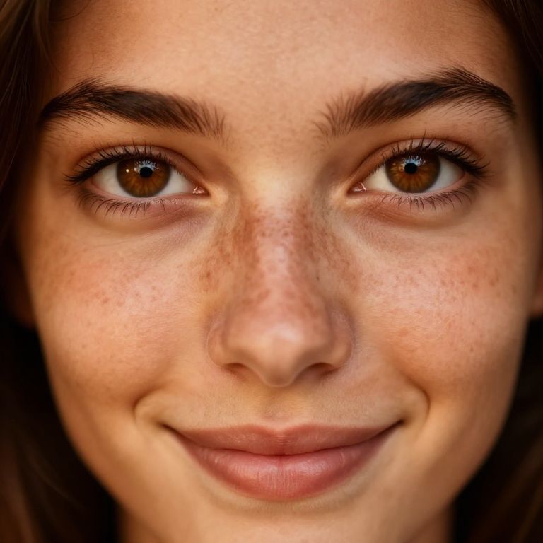 Brown eyes captivating close-up, glowing under soft natural light, rich earthy tones, reflecting warmth and depth, surrounded by subtle freckles and gentle smiles, photorealistic style with vibrant color contrast, evoking beauty and mystery.