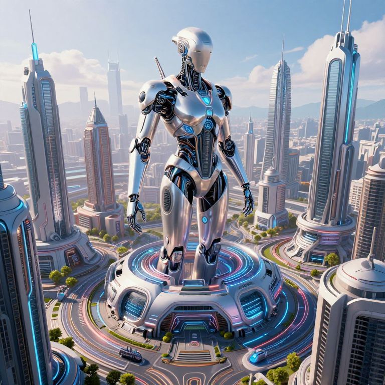 Giant, futuristic, silver robotic figure stands on a circular, neon-lit platform in a bustling, high-tech cityscape with skyscrapers.