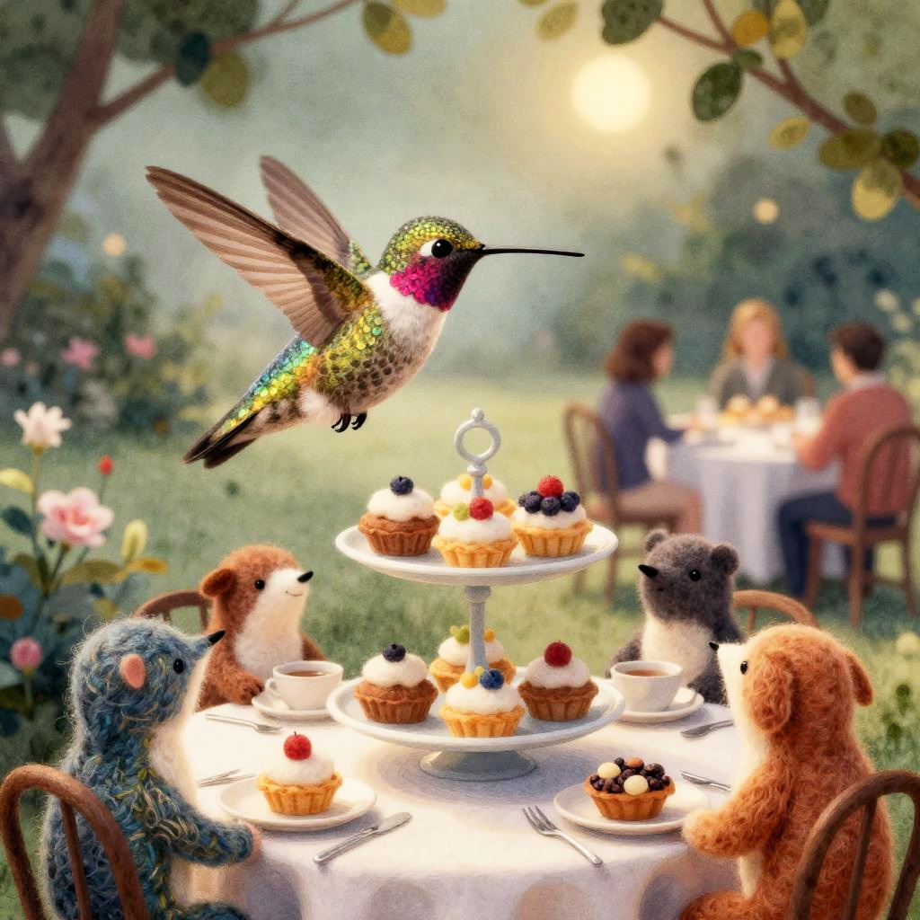 A vibrant park scene bathed in warm sunlight featuring a playful brown and white dog chasing a pink ball in the foreground. The park is lush with green grass, colorful flowers, and a variety of trees with green and orange foliage. Several people are enjoying the parkāsome sitting on benches and others dining at outdoor tables. Additional dogs roam freely, creating a lively and friendly atmosphere. In the background, classic architectural buildings with domes are visible under a clear blue sky.