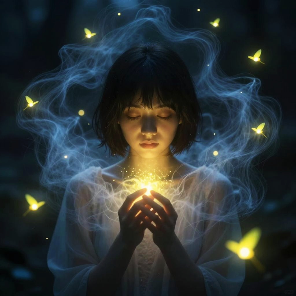 Digital art of a serene woman with short, dark hair, glowing softly in the center. She's surrounded by swirling blue mist and enveloped in a cocoon of floating, bright yellow-orange fireflies. Her eyes are closed, and her expression is peaceful. The background is dark, making the glowing elements and her face stand out. The style is ethereal and magical.
