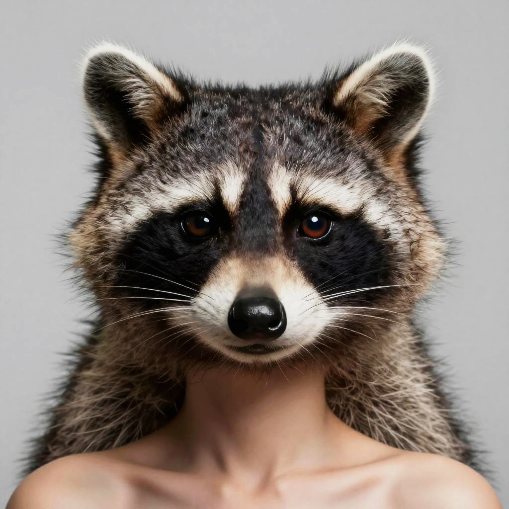 Racoon face human hybrid, symmetrical composition, half racoon half human face blending seamlessly, vivid eyes, realistic fur details combined with smooth human skin, softly lit studio background, imaginative cross-species artwork