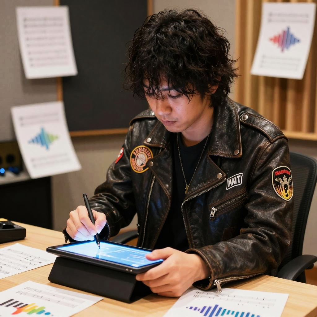 Realistic photo.a charismatic musician, wearing a vintage leather jacket with band patches, drawing on a glowing digital tablet, surrounded by scattered sheet music and colorful sound wave icons, in a cozy recording studio, depicted in the refined and narrative-driven style of Takeshi Obata. realistic photo