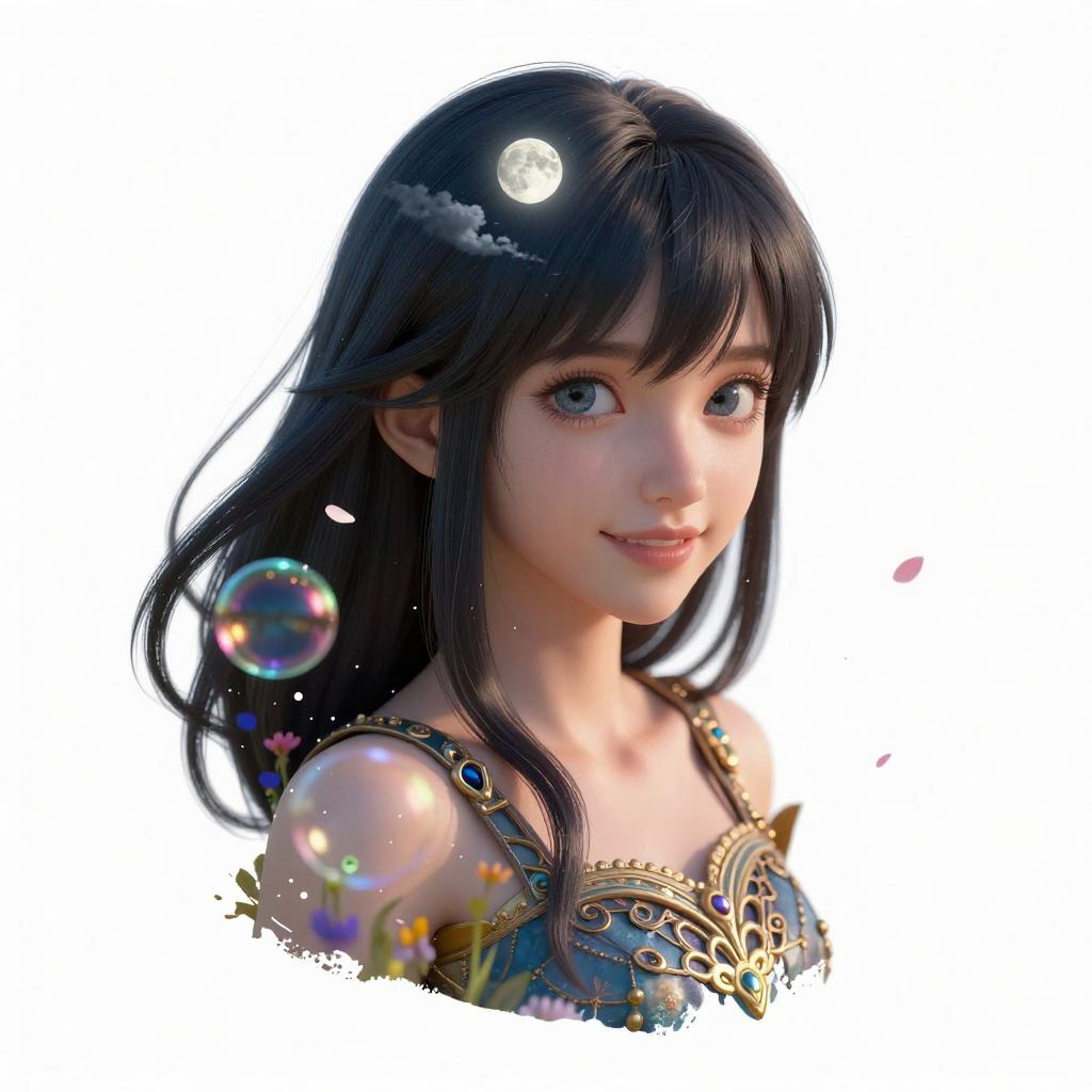 [(white background:1.5), ::5] (isometric:1.0), double exposure, bubble, mid shot, full body, //masterpiece, best quality, 1girl, (colorful), (finely detailed beautiful eyes and detailed face), cinematic lighting, bust shot, extremely detailed CG unity 8k wallpaper, black hair, long hair, black eyes, solo, smile, intricate skirt, ((flying petal)), (Flowery meadow) sky, cloudy_sky, building, moonlight, moon, night, (dark theme:1.3), light, fantasy, looking at viewer