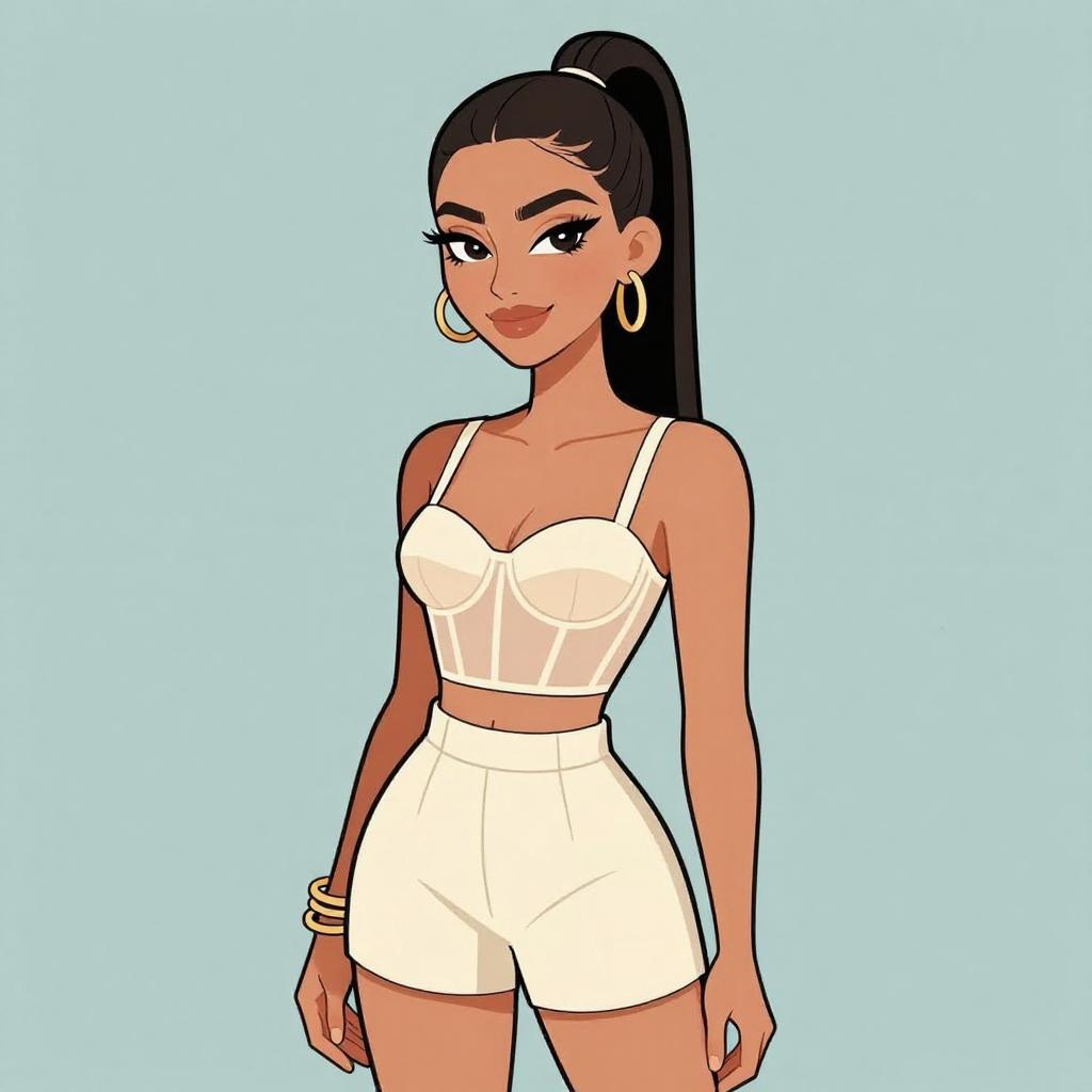 Digital cartoon of a smiling woman with long black hair, wearing a black, strapless, sheer-sleeve bodysuit and large hoop earrings.