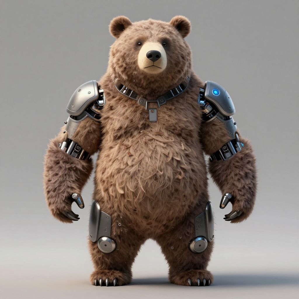 CGI image of a robotic brown bear with metallic shoulder and limb armor, standing on a gray gradient background.