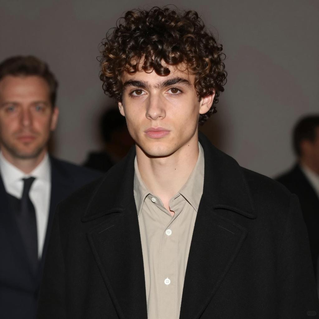 Young white man with curly brown hair, light skin, serious expression, wearing a dark suit with gold-trimmed lapels and a light-colored button-up shirt, centered in the foreground. Background has a blurred red light and two people, one woman with curly hair and floral dress, the other woman with short dark hair and blue top, slightly out of focus.