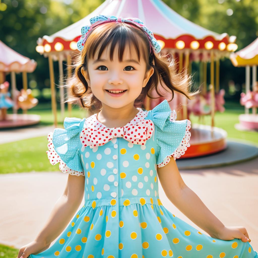 A playful girl, wearing a cute polka dot dress, smiling at the camera in a park with a whimsical carousel on a sunny day.