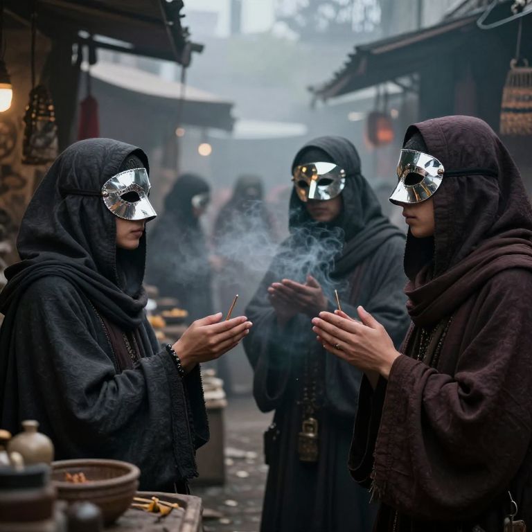 In a dimly lit marketplace shrouded in mist, cloaked figures adorned in mirrored masks engage in silent exchanges, their hands trembling with the weight of forgotten histories and whispered promises, as the air carries the faint scent of incense mingling with the echoes of lost futures.