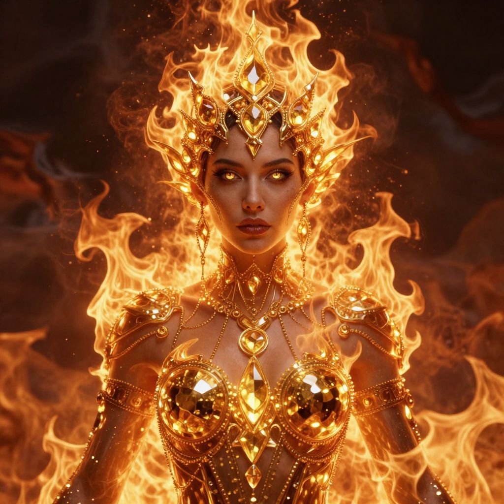 Photorealistic digital artwork of a fierce, ethereal woman with glowing, fiery hair and intense, golden eyes. She wears an ornate, gold crown and matching armor adorned with reflective, gem-like plates that appear to be made of molten metal. Flames engulf her, highlighting her regal, powerful presence. The background is dark, contrasting with the bright, intense orange and yellow flames. Her expression is determined and commanding, enhancing her mythical, almost demonic beauty. The image blends fantasy and fire, creating a dramatic, otherworldly effect.