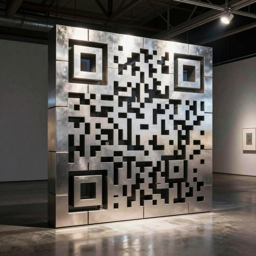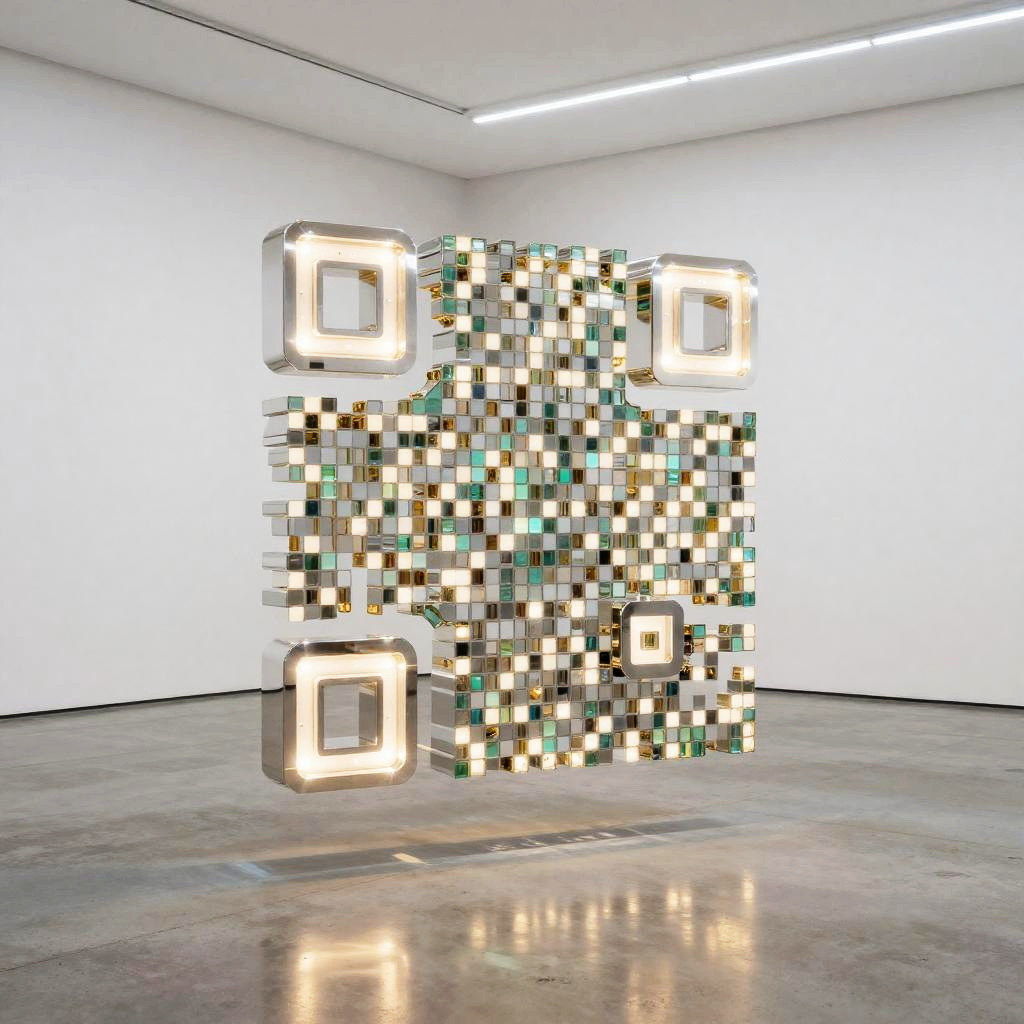 Creative QR code art styled as a three-dimensional sculpture made of reflective metal and glass elements, glowing softly with embedded LED lights, floating in a minimalistic modern gallery space with clean white walls and polished concrete floor.