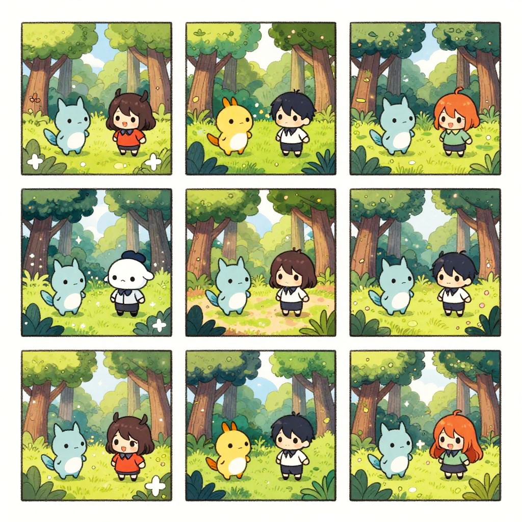 Japanese comic styles, whimsical fantasy world, cute chibi characters, enchanting forests and mystical creatures, playful compositions with bright and saturated colors, hand-drawn aesthetic