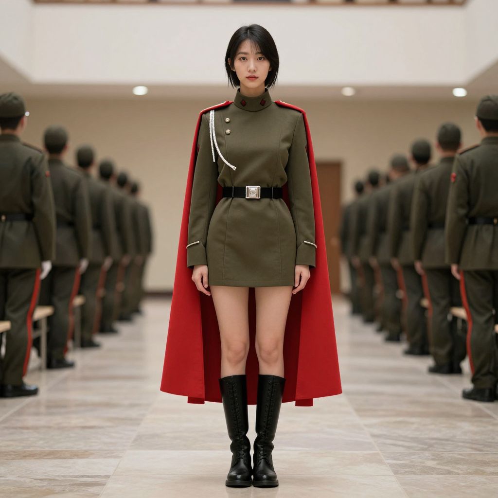 Photograph of an East Asian woman with short black hair, wearing a dark green military-style dress with long sleeves and a high collar, paired with a red cape that drapes over her shoulders. She has a black belt with a silver buckle and black knee-high boots. She stands confidently in the center of a brightly lit, large, tiled room with a symmetrical arrangement of uniformed men in dark green military attire, seen in the background. The men are standing in rows, with their backs to the viewer, adding depth and contrast to the image.