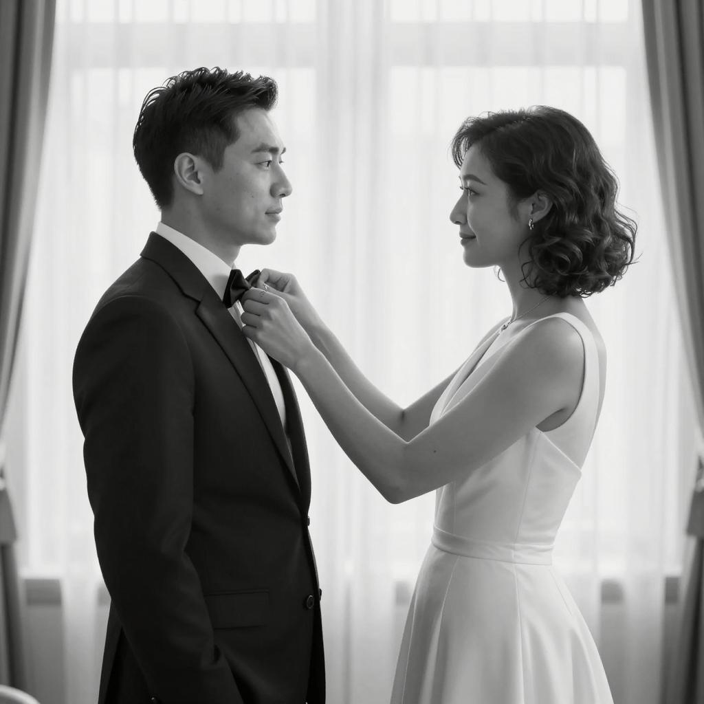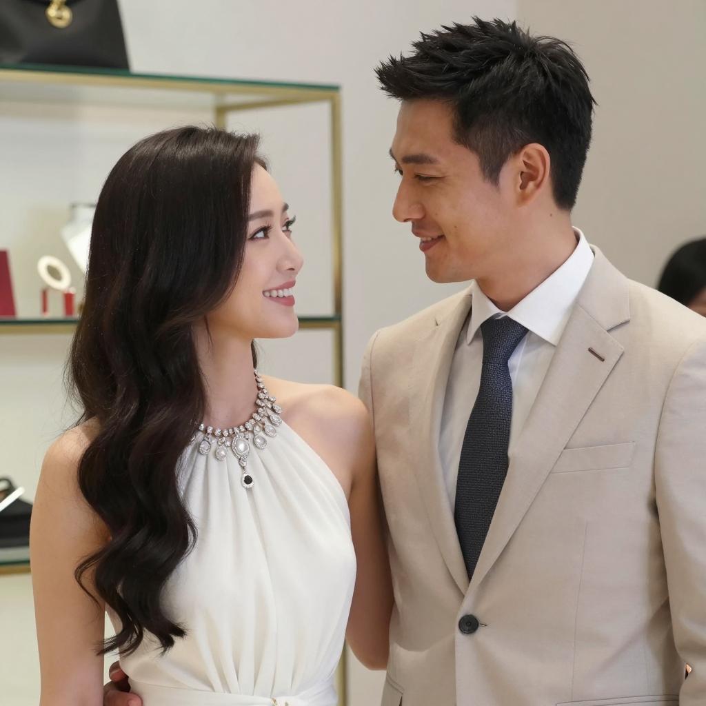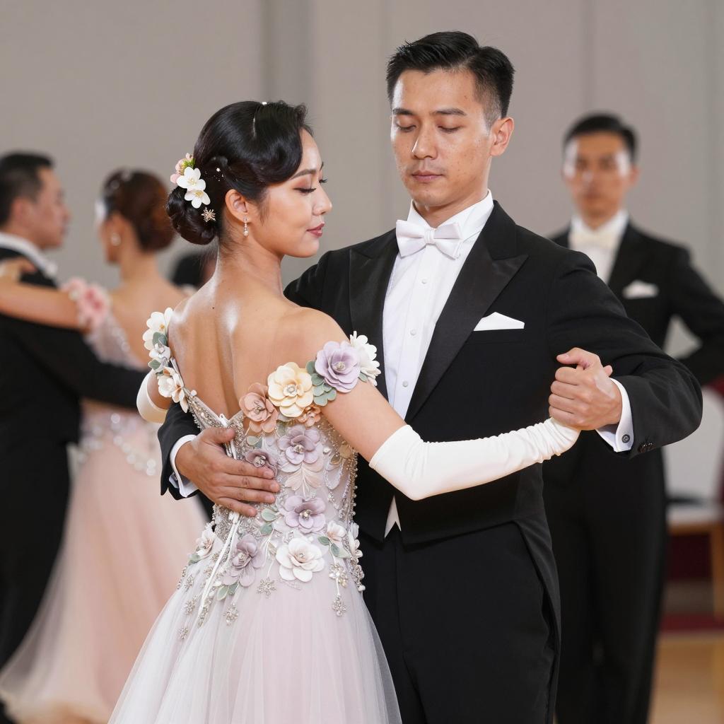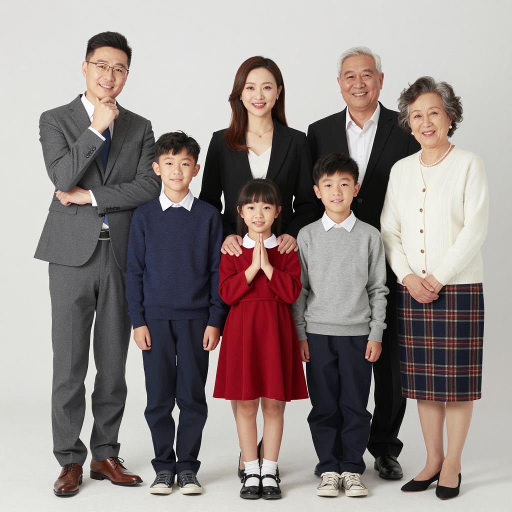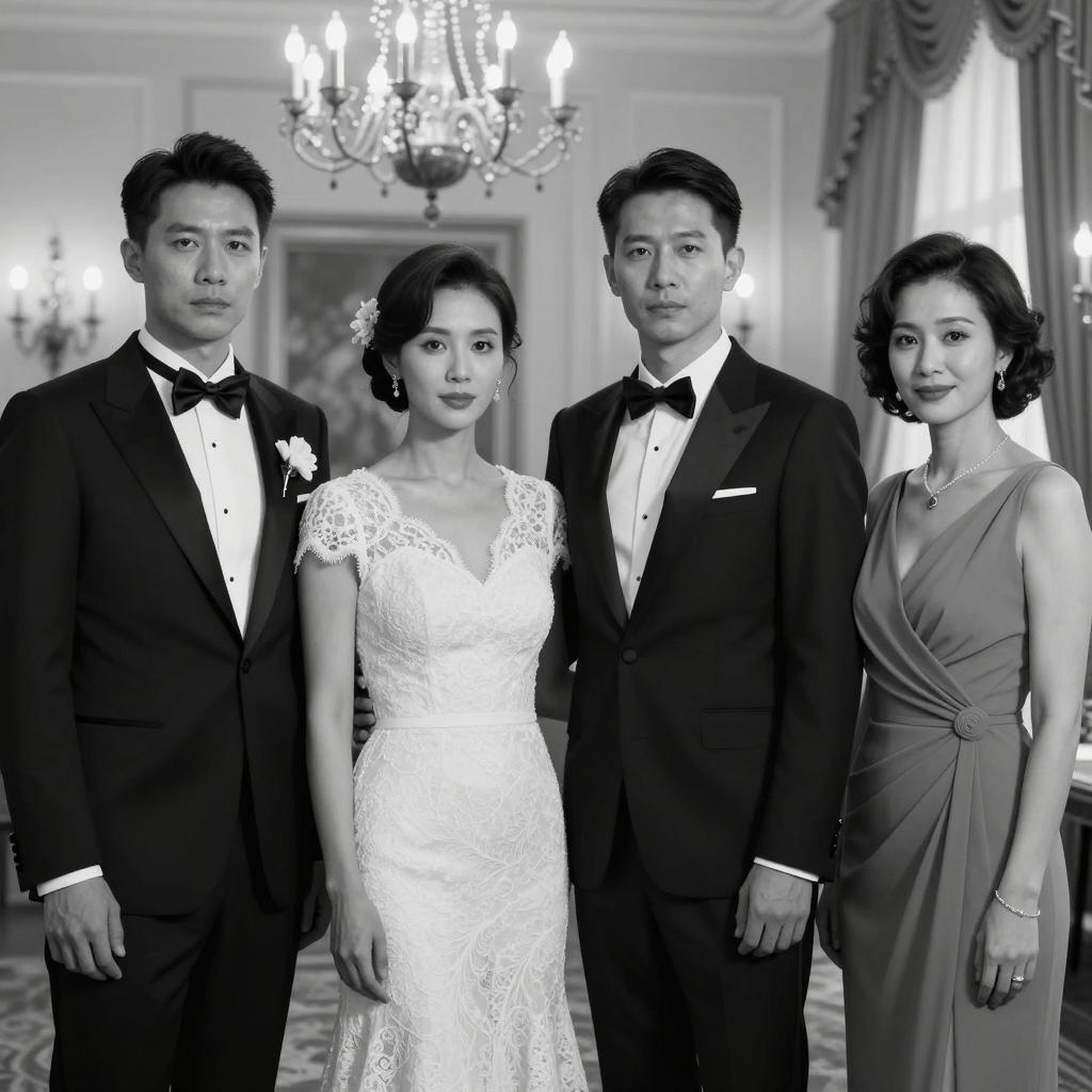 Family photograph on a stage. Man in white tuxedo, purple-dressed woman, red-dressed woman, five children in pink and white dresses, large dog. Background: ornate stage with lights, other people, flowers. Children hold hands with adults, smiling. Center child holds adult's hand. Stage decorations include arches, lights, and floral arrangements. Group stands in a circular pattern on stage.