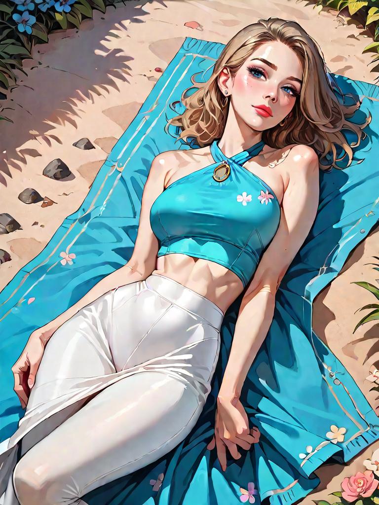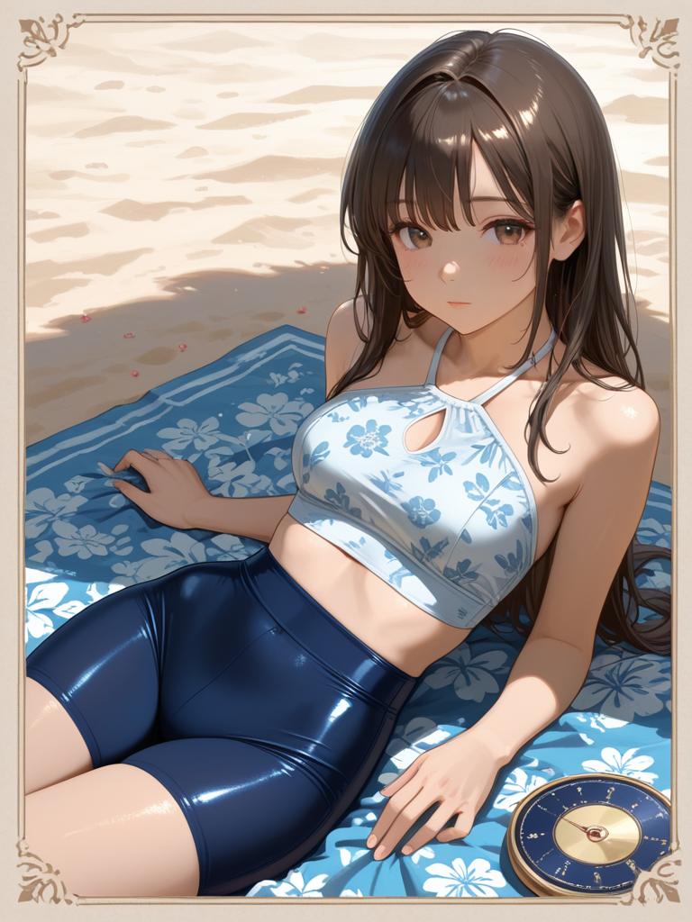 Realistic anime-style illustration of a young woman lying on a sandy beach. She wears a high-waisted deep navy blue tankini with quick-dry spandex material and a halter neck top featuring subtle blue floral patterns. The coordinating beach towel beneath her also has a blue floral design and a stitched border. The setting includes soft sandy beige sand with a terry cloth textured towel, creating a relaxed beach atmosphere.