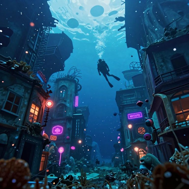 A diver's perspective unveils an urban landscape submerged in the depths, where buildings stretch upward in surreal distortions, their silhouettes altered by aquatic pressure and mystery. The cityscape morphs into a dreamlike sky of abstract shapes, while neon lights engage in a mesmerizing ballet with sparkling particles that illuminate the weathered facades below. Enigmatic marine creatures peer out from concealed nooks, infusing this fantastical submerged world with curiosity and enchantment where dreams merge with reality beneath the waves.