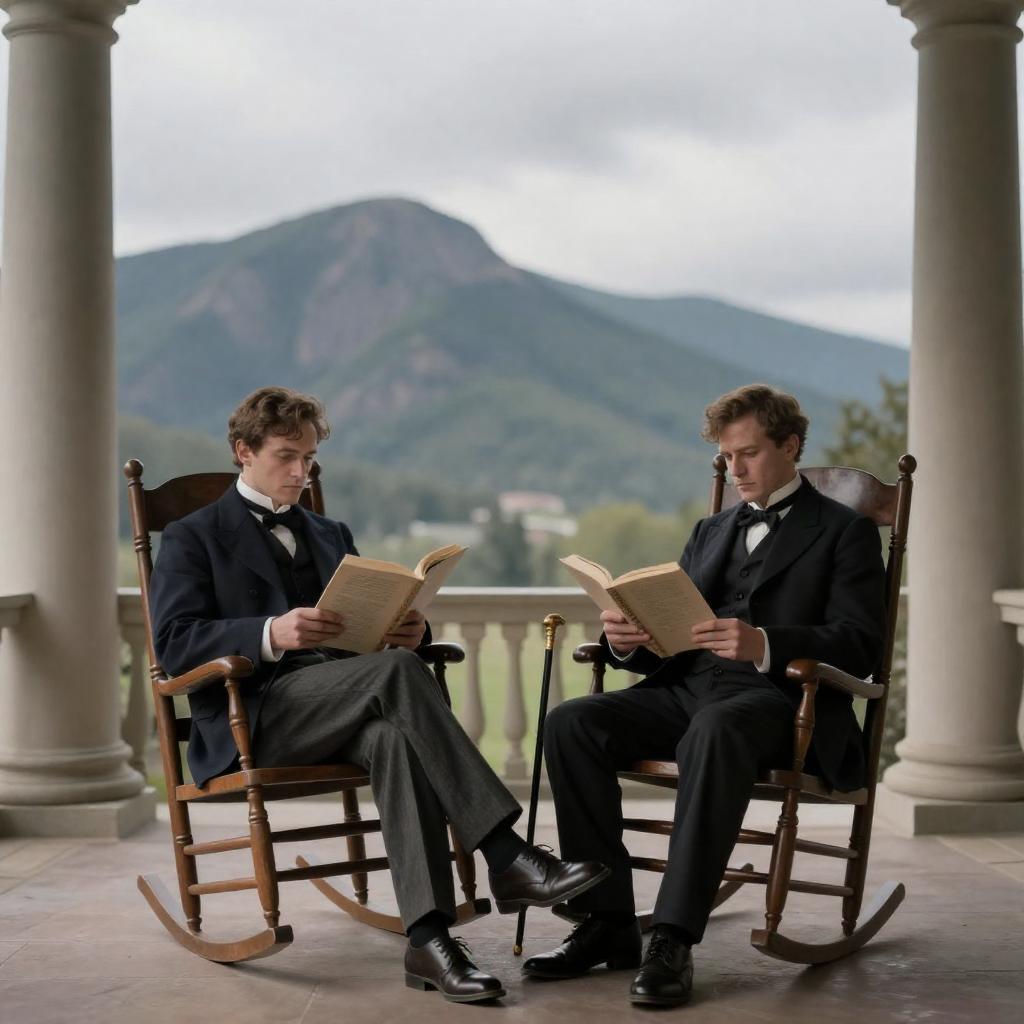 Two men dressed in Victorian-era clothing, including black jackets, bow ties, and gray trousers, sit in wooden rocking chairs on a porch framed by large columns. Both are reading books with serious expressions. One man holds a black cane with a gold handle. The background features cloudy skies and distant rocky, cloud-covered mountains.