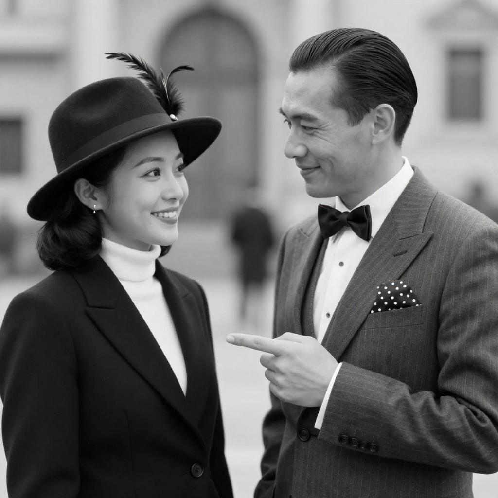Black and white photograph of a man and woman. Man with slicked-back hair, dark suit, serious expression, facing left. Woman with curled shoulder-length hair, light-colored coat, smiling softly, facing right. Background is blurred. Both looking at camera.