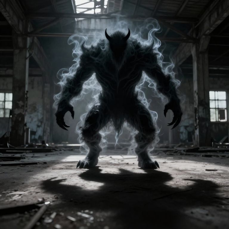 Humanoid shadow monster art, shadowy beast with ethereal smoky edges, menacing posture in abandoned warehouse, dramatic lighting casting long shadows, dark fantasy style