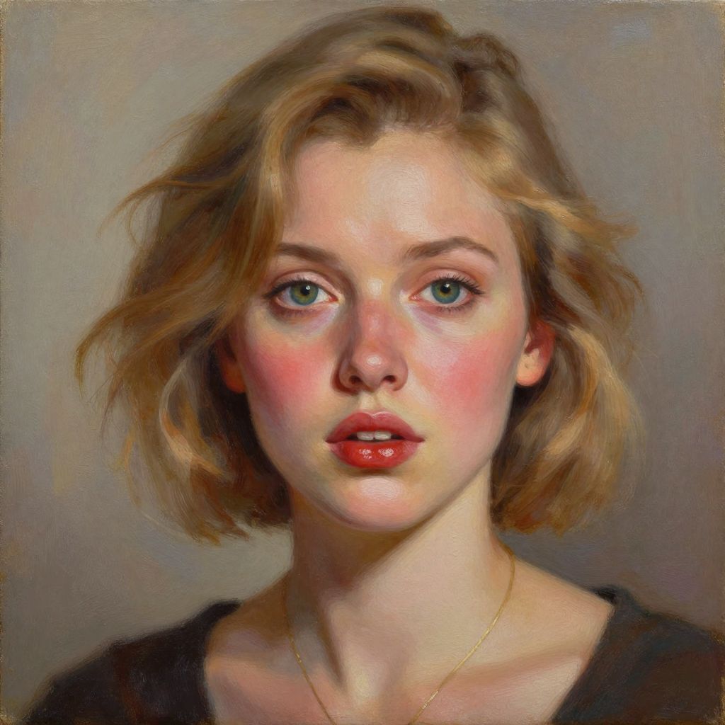 Contemporary oil painting portrays a detailed emotional portrait of a woman with short, wavy blonde hair, featuring vivid green eyes, rosy cheeks, and glossy red lips, set against a neutral background with soft lighting that highlights her expressive gaze and subtle necklace.
