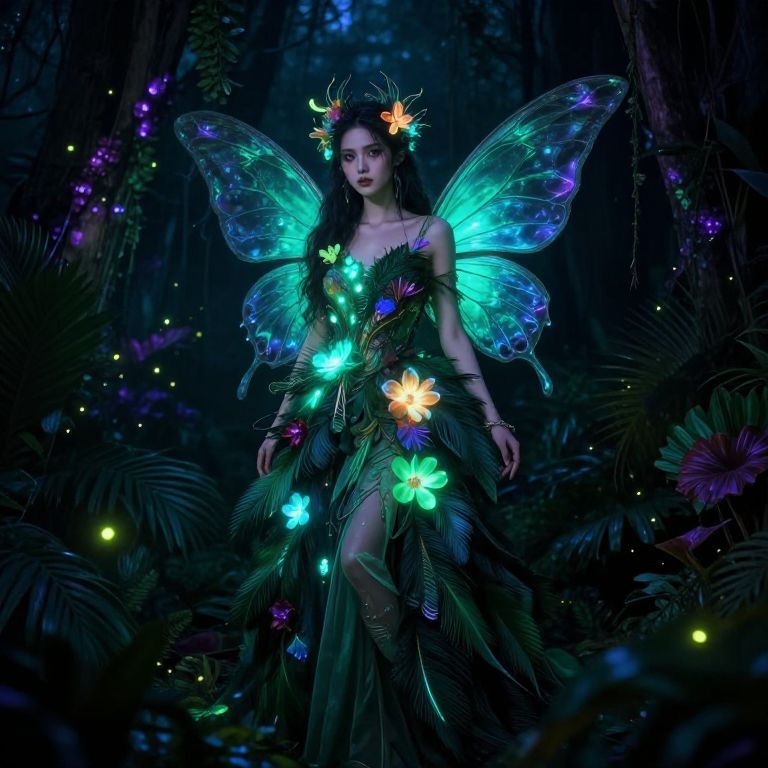 Fantasy dress art portraying a tropical-themed gown adorned with exotic luminescent flowers and iridescent feathers, worn by a mysterious forest nymph amid dense magical flora and glowing fireflies, with vibrant greens and deep purples creating a hypnotic, otherworldly atmosphere.