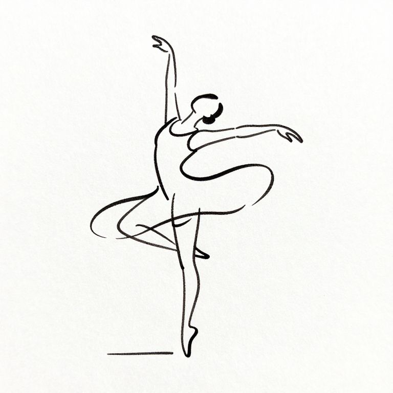 A line drawing of a graceful dancer in motion, fluid and dynamic lines capturing movement, minimalistic yet expressive, black ink on textured white paper, emphasizing form and emotion through simplicity