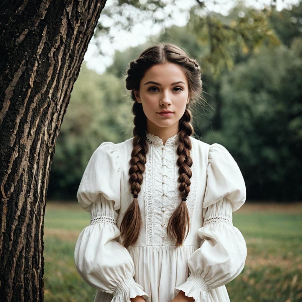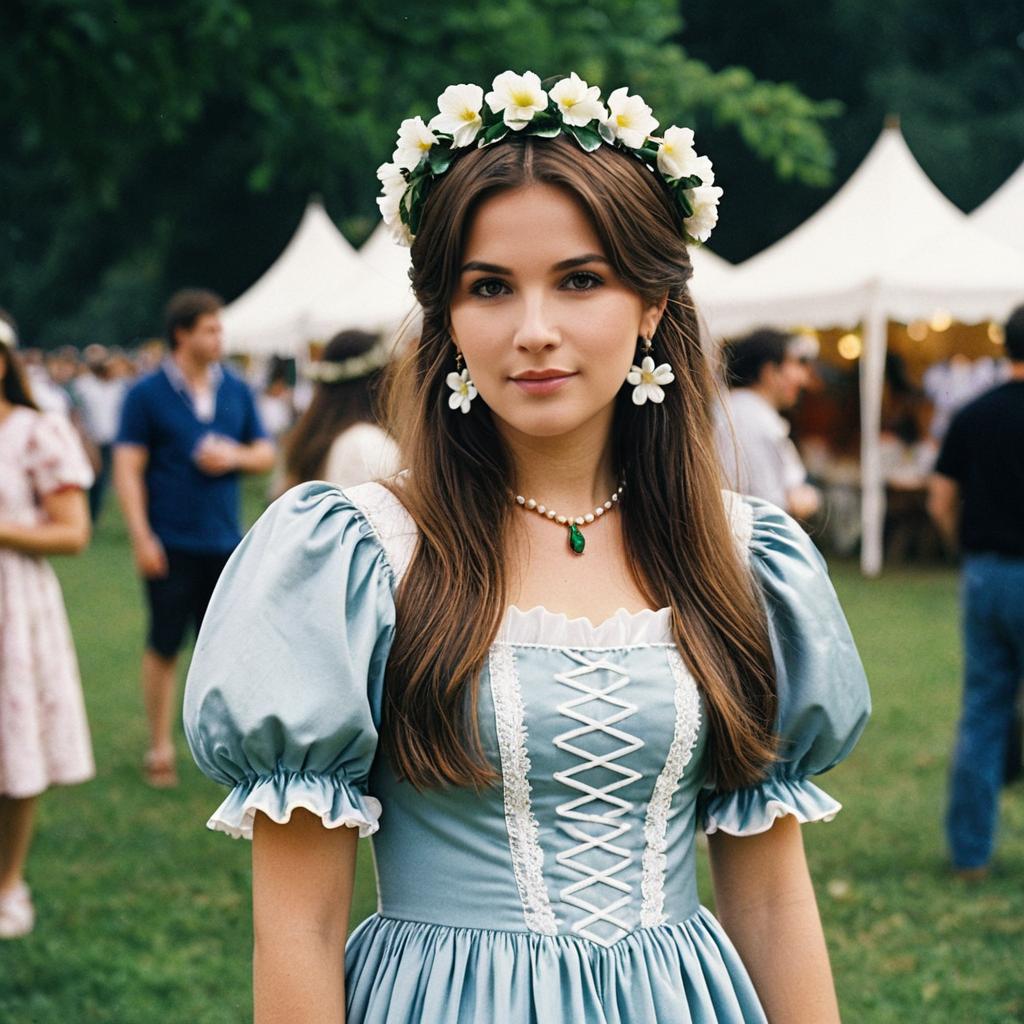 English festival costume,1girl, dress, solo, brown hair, jewelry, head wreath, long hair, earrings, flower, tree, blurry, blurry background, looking at viewer, puffy sleeves, outdoors, realistic, short sleeves, puffy short sleeves