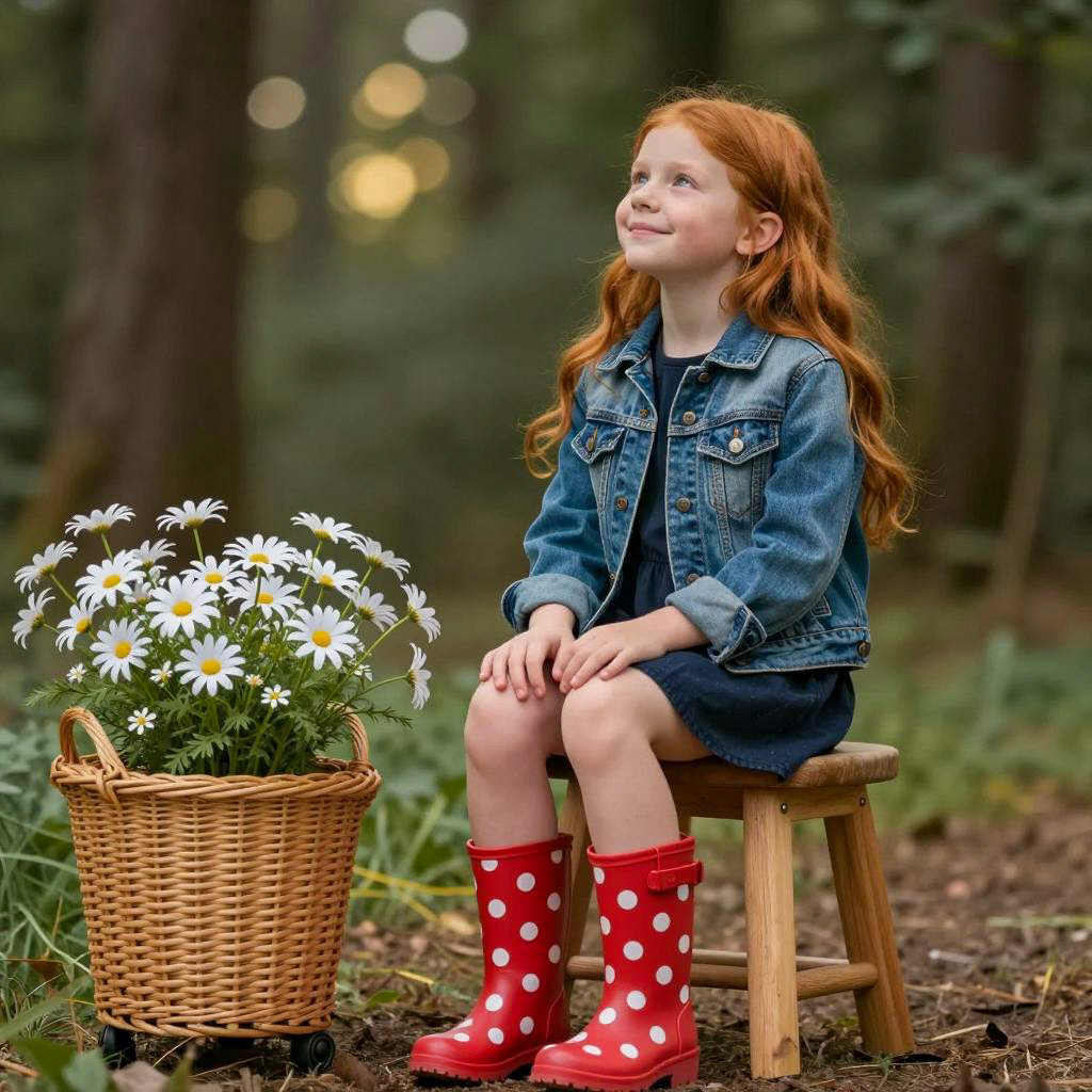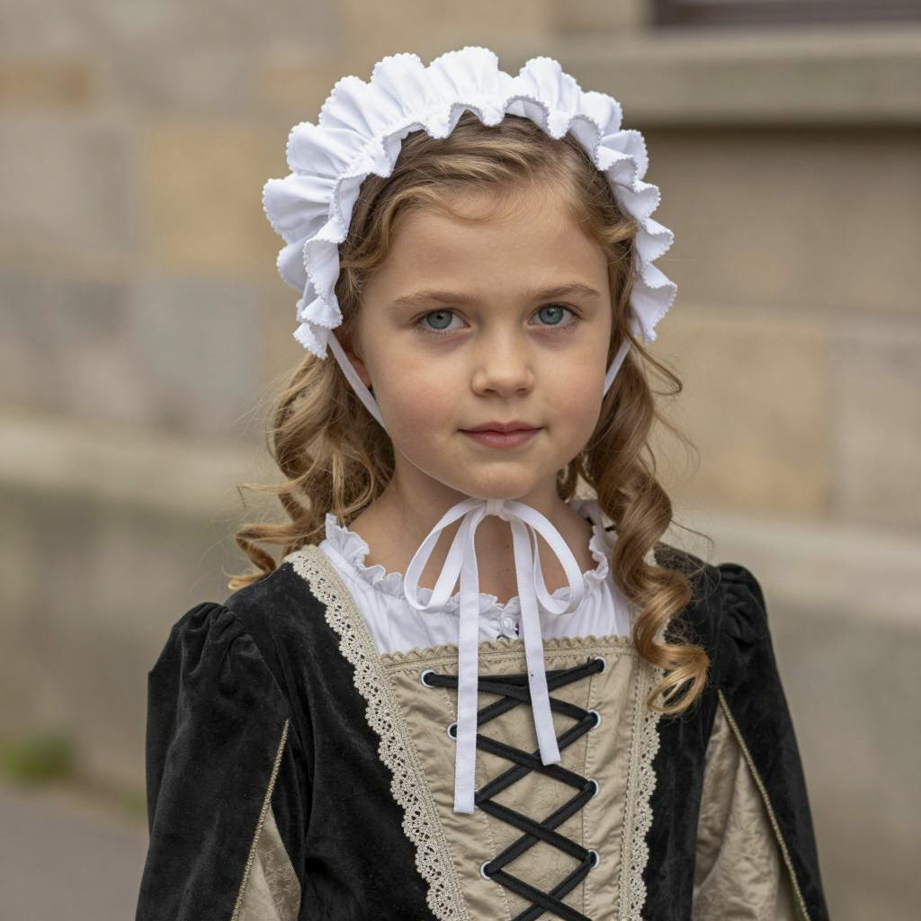 A young girl with light brown curly hair wearing a white bonnet with ruffled edges and a white dress with colorful floral embroidery looks upward thoughtfully. A brown horse with a green harness is partially visible in the background, standing on a ground covered with fallen autumn leaves.