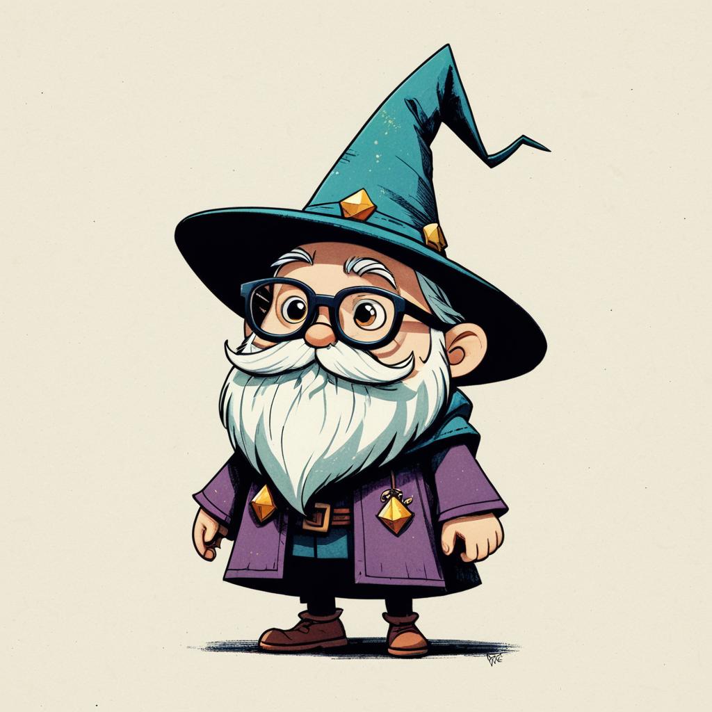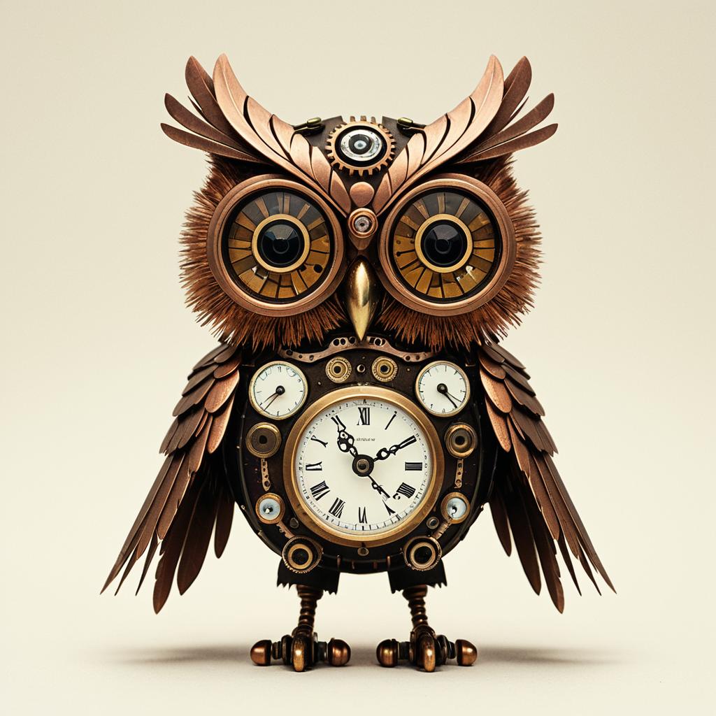 Tiny tiny clockwork owl, glass eyes, brass feathers, steampunk illustration, muted copper tones, Skottie Young style, standing character, Pixar-style, surreal and modular constructivism design, square image.