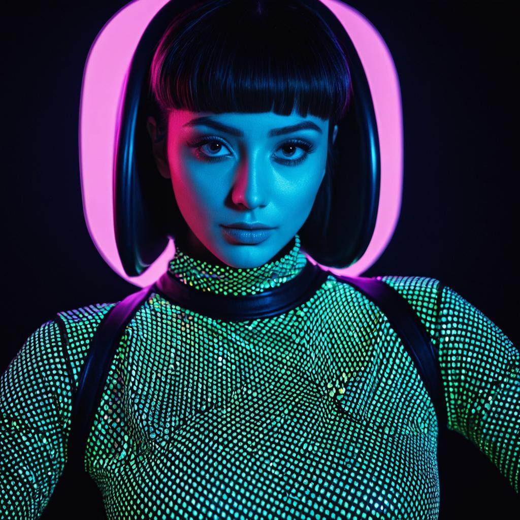 Ultra close-up portrait of a futuristic androgynous model with sleek black hair and big eyes, wearing a neon reflective mesh bodysuit with holographic trims. The image features cinematic lighting with blue and pink neon hues that highlight hyperreal textures and create a sci-fi aesthetic.