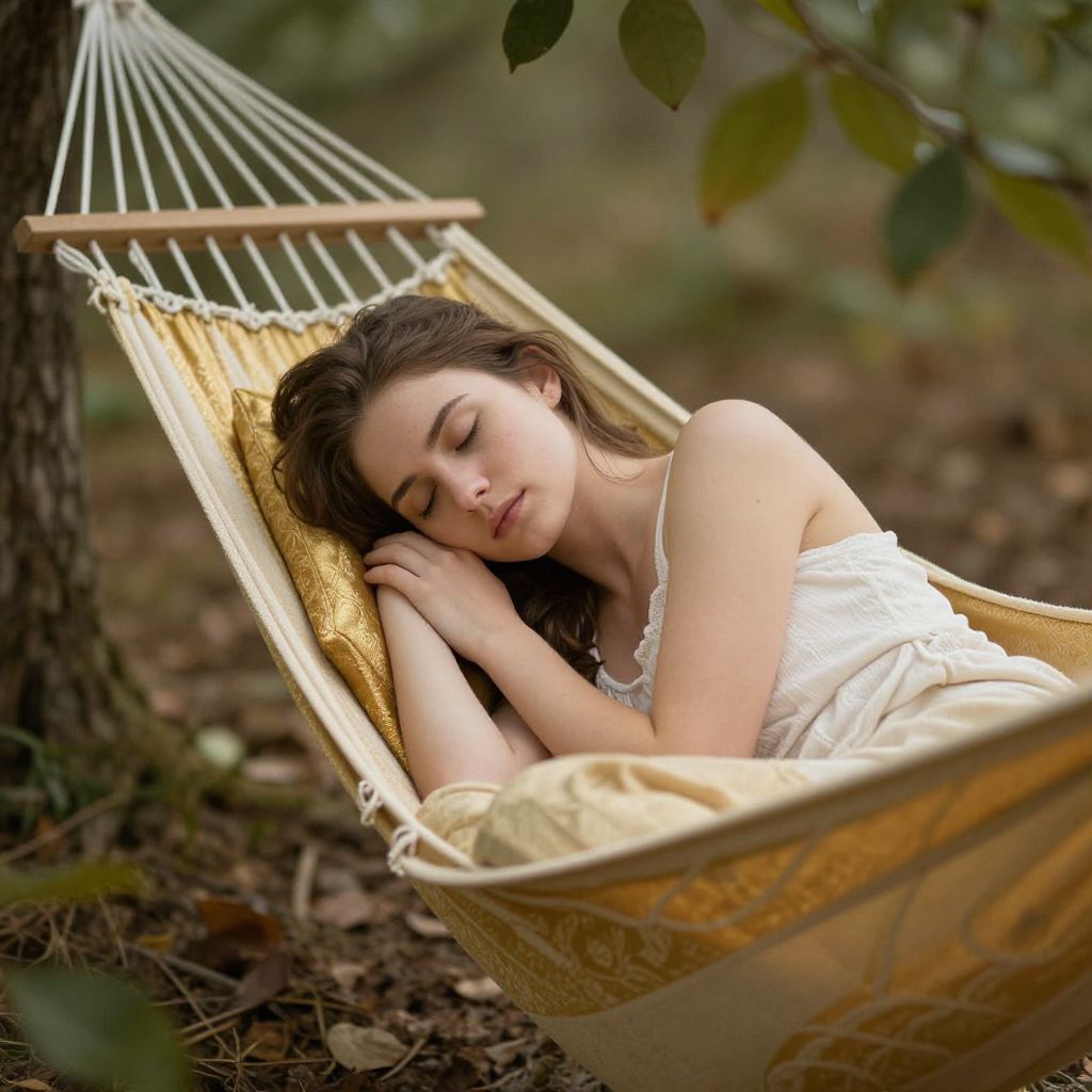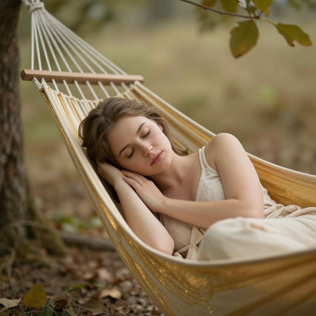 Serenity cradles the soul as a woman rests in a golden hammock, her eyes closed in peaceful repose, surrounded by the gentle hum of rustling leaves and the soft embrace of nature’s eternal rhythm.
