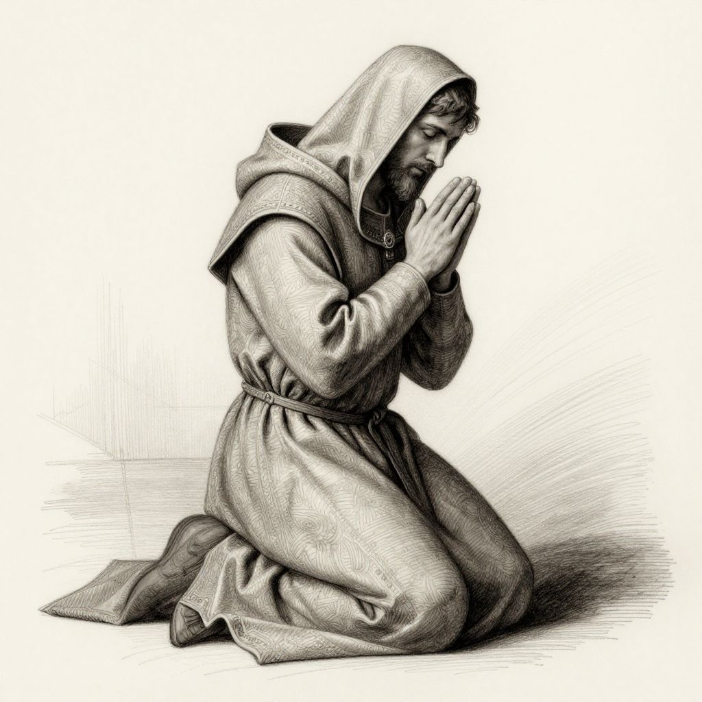 The image depicts a highly detailed, realistic sketch of a man in a medieval setting, kneeling on the ground and praying. The man is dressed in a full-length robe, with a hood pulled over his head, adding to the sense of solemnity and reverence. His hands are clasped together in a gesture of prayer, and his posture is humble and introspective. The sketch is rendered in a monochromatic palette, with shades of gray and black creating a dramatic and textured effect. The background is minimalistic, allowing the viewer to focus on the man and his actions. The overall composition is balanced, with the man centrally positioned and the sketch lines meticulously drawn, capturing the intricate details of his clothing and the folds of his robe. The scene evokes a sense of quiet contemplation and devotion, characteristic of religious art from the medieval period.
