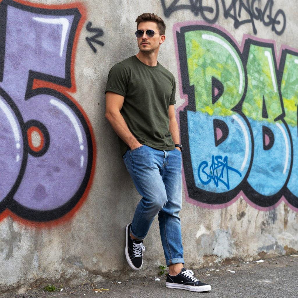 3/4 body pose of a stylish man in casual streetwear leaning against a graffiti wall, urban environment, natural lighting, vibrant and detailed textures