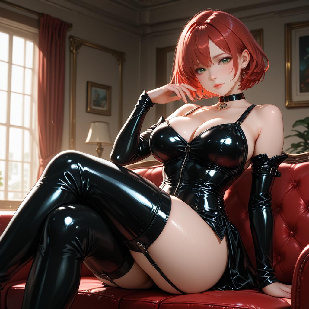 1girl, realistic face, Thigh-high black leather boots, pointed toe, stiletto heel, fringed hemline, deep burgundy velvet dress, sleeveless, fitted bodice, intricate beadwork, asymmetrical cut, bold statement piece, chic and edgy.