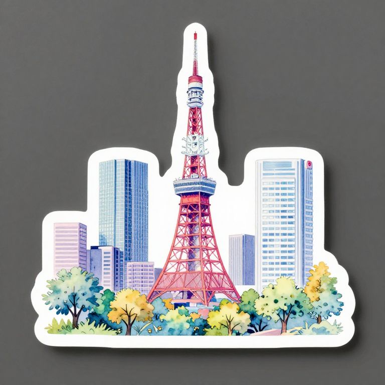 Digital illustration of Tokyo skyline featuring red Tokyo Tower surrounded by colorful trees, blue and white skyscrapers on white outline background.