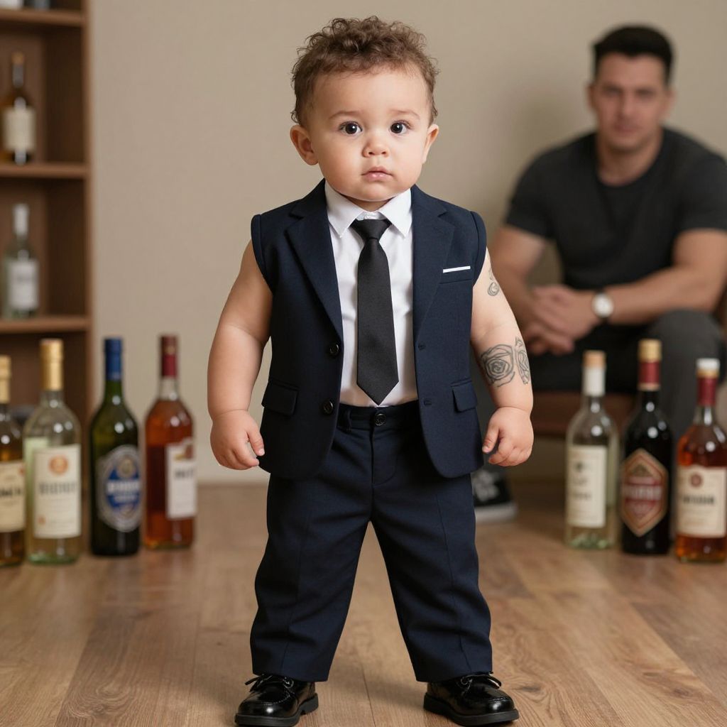 In the image, a toddler stands confidently in a room adorned with a warm, earthy color palette. The child is dressed in a dark blue suit jacket over a white undershirt, exuding an air of authority and strength. The suit is well-fitted, highlighting the toddler's muscular build, which is accentuated by the tattoo on his left arm. The background features a table covered with a red cloth, upon which several bottles are neatly arranged. A man in a suit stands in the distance, adding to the sense of a formal or significant setting. The overall composition suggests a scene of power and control, with the toddler as the central figure, embodying the strength and determination of a crime gang member.