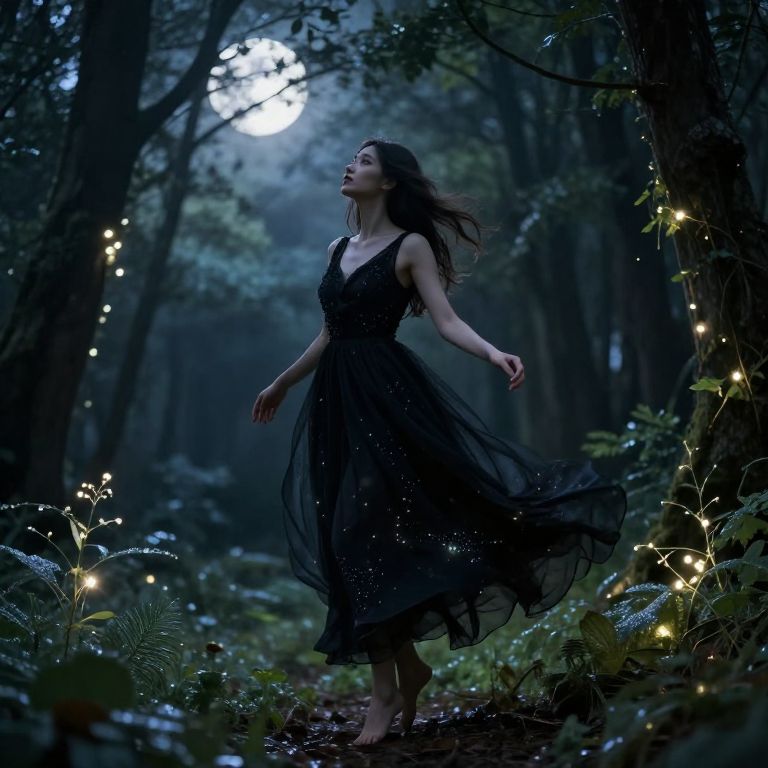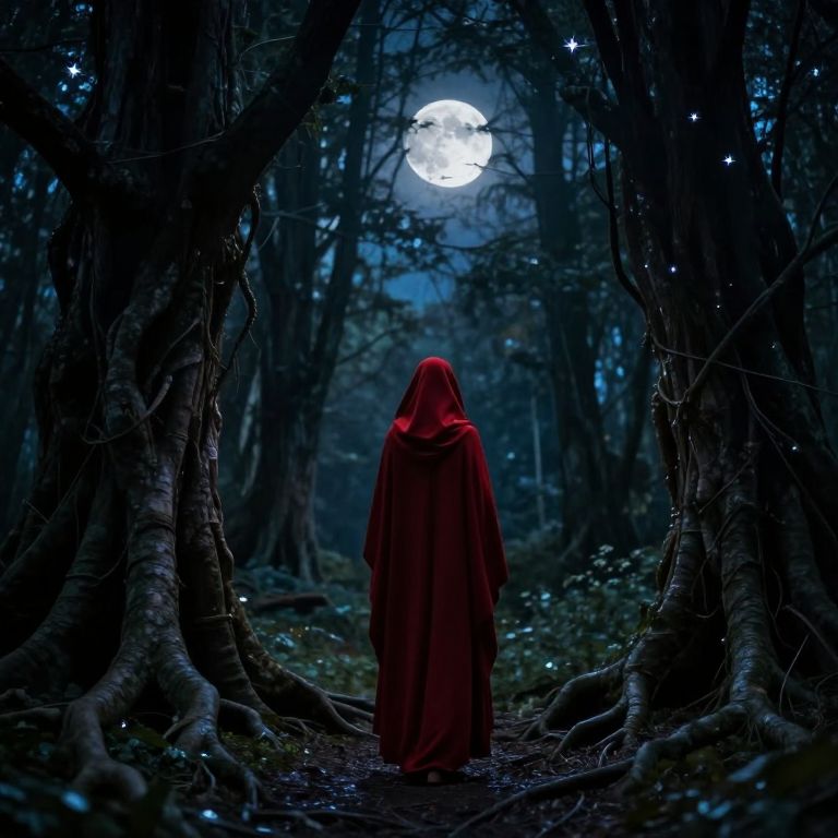 In the quiet embrace of a moonlit forest, a solitary figure draped in crimson stands at the threshold of mystery, where ancient roots whisper secrets of eternity and the stars above mirror the soul’s unspoken yearning for connection amidst the silence.