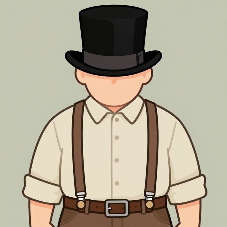 A cartoon image of a person wearing a top hat and suspenders. The person is wearing a beige shirt with a brown belt and a pair of striped socks.