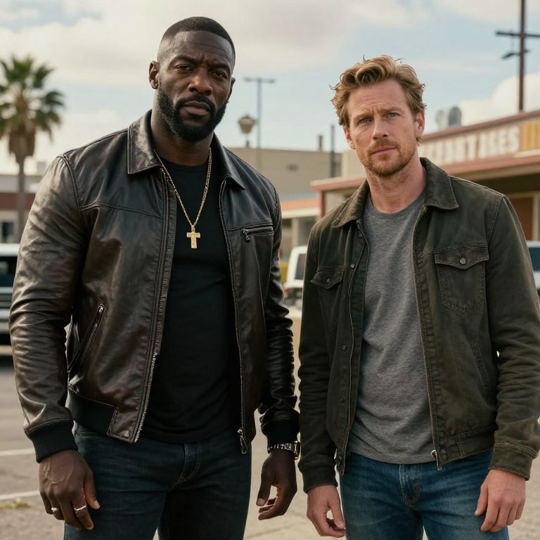 Photograph of two men standing side by side in a modern, dimly lit room. Both wear black leather jackets over dark gray shirts and black pants. The man on the left has light brown hair, a serious expression, and fair skin. The man on the right has short, dark hair, a beard, and a slightly tanned complexion. The background features a blurred, illuminated doorway and a smooth, gray wall. The lighting is soft, creating a slightly moody atmosphere. Both men exude a tough, serious demeanor.